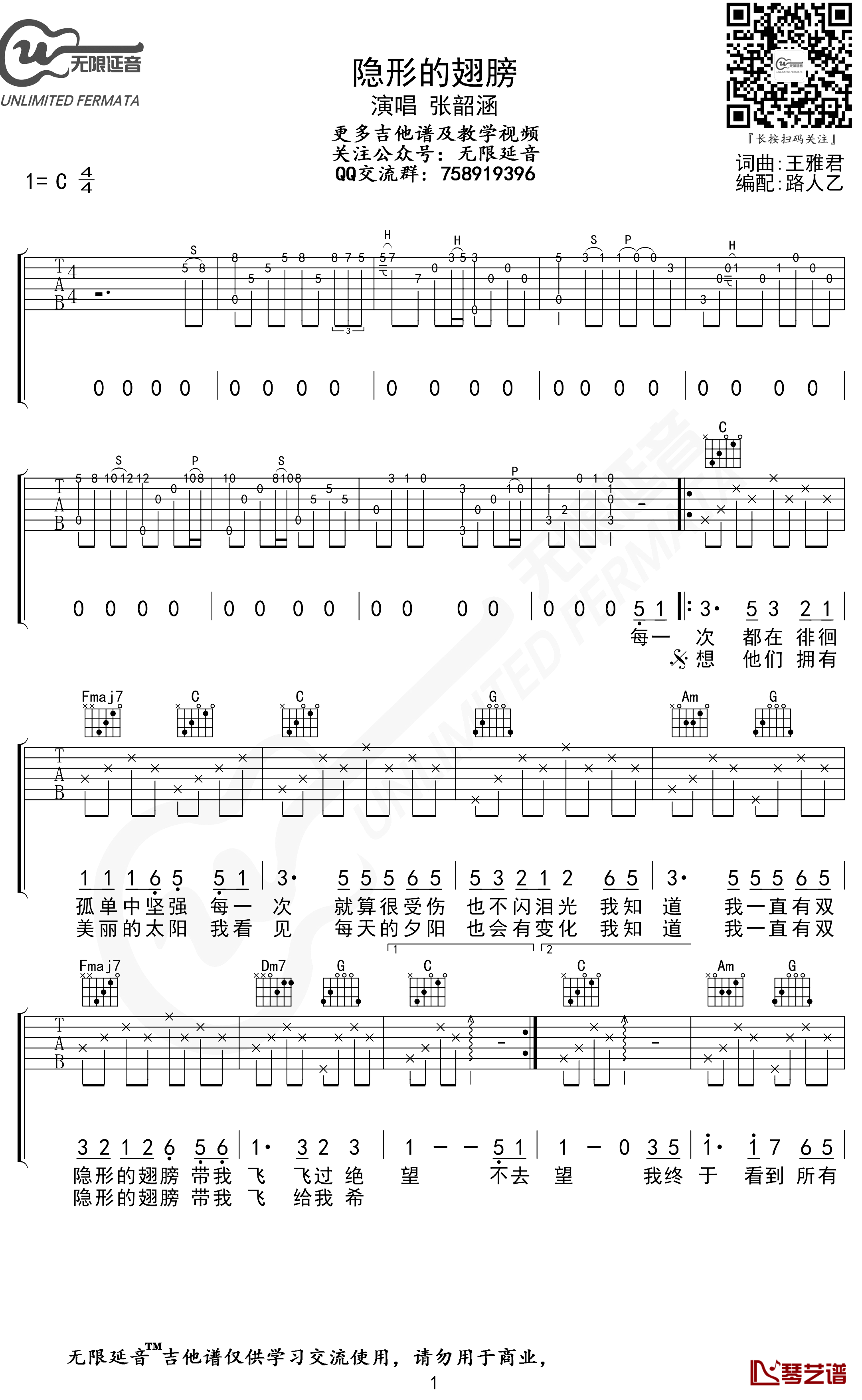 张韶涵隐形的翅膀吉他谱,原调#C选调C,变调夹夹一品,隐形的翅膀六线谱,图片谱高清版,民谣吉他四级考级曲目。...