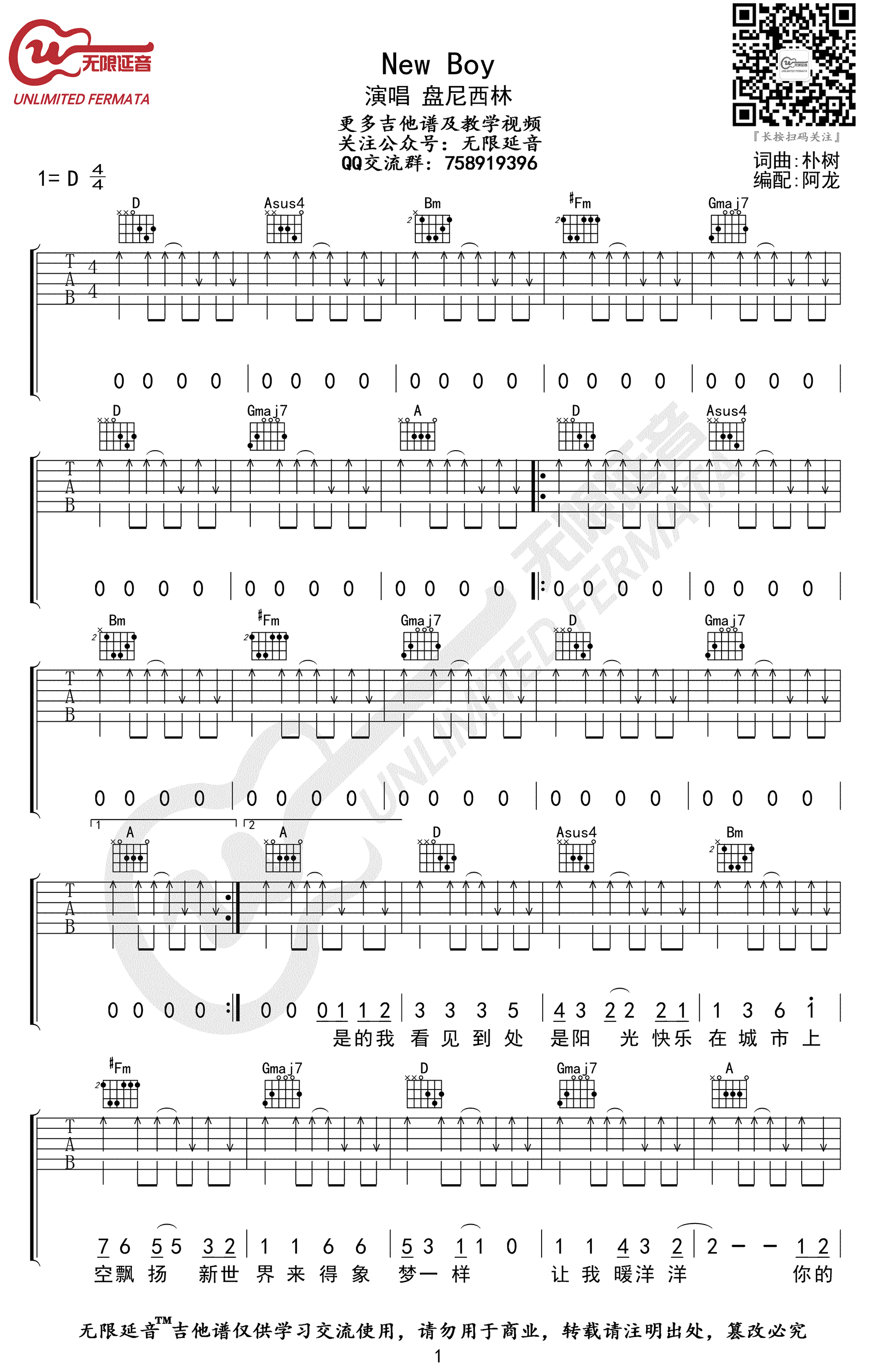 《NewBoy》吉他谱,盘尼西林演唱,D调指法,NewBoy六线谱,完整版共四张弹唱图片谱。无限延音编配...