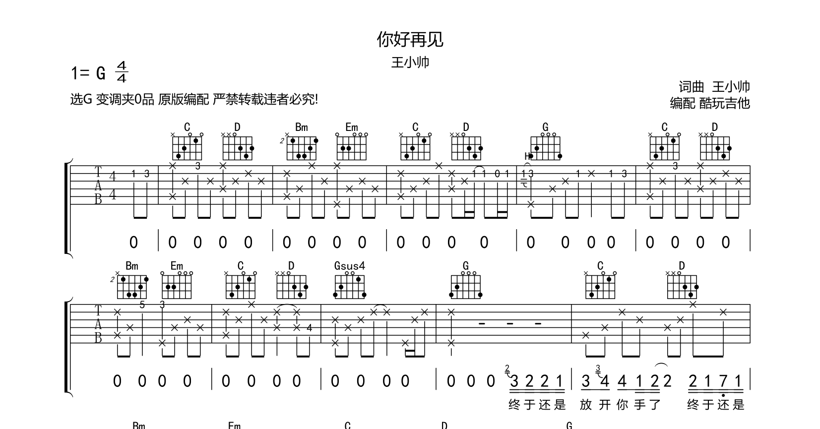 吉他你好再见 王小帅 吉他谱 原版编配