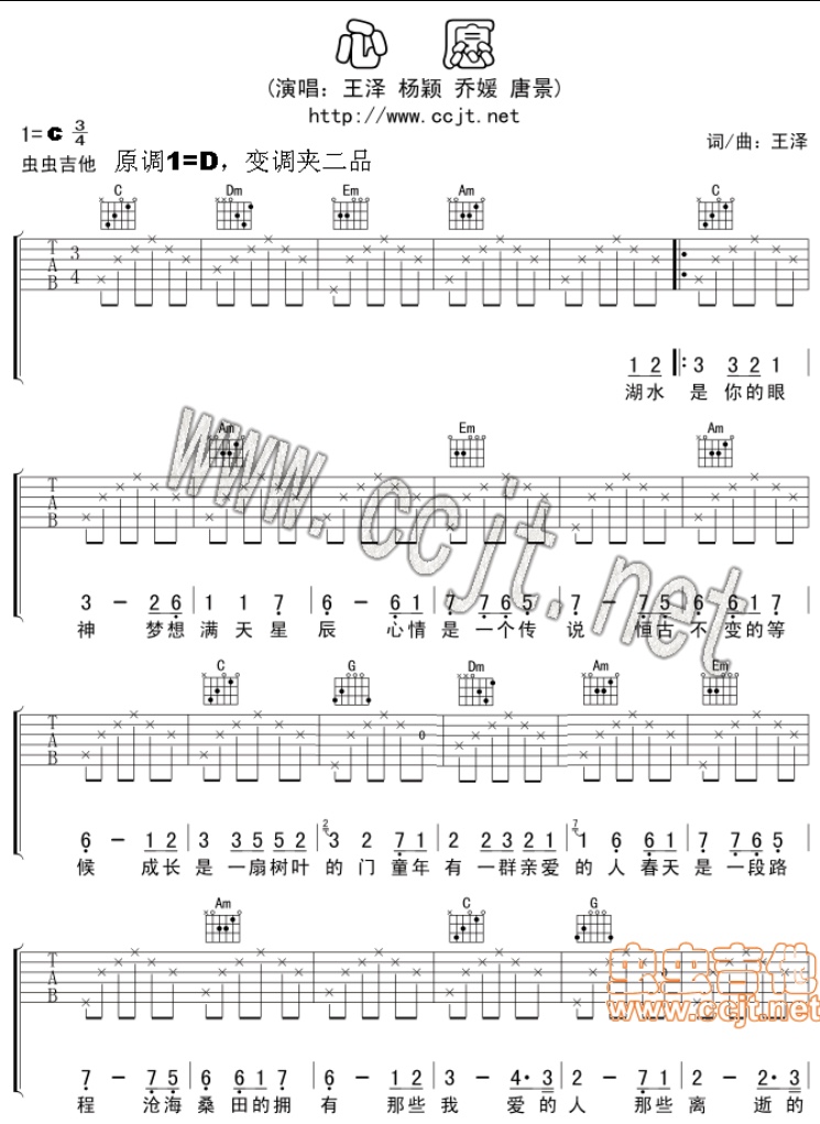 吉他王泽/杨颖等《心愿》吉他谱 C调弹唱谱 两个版本