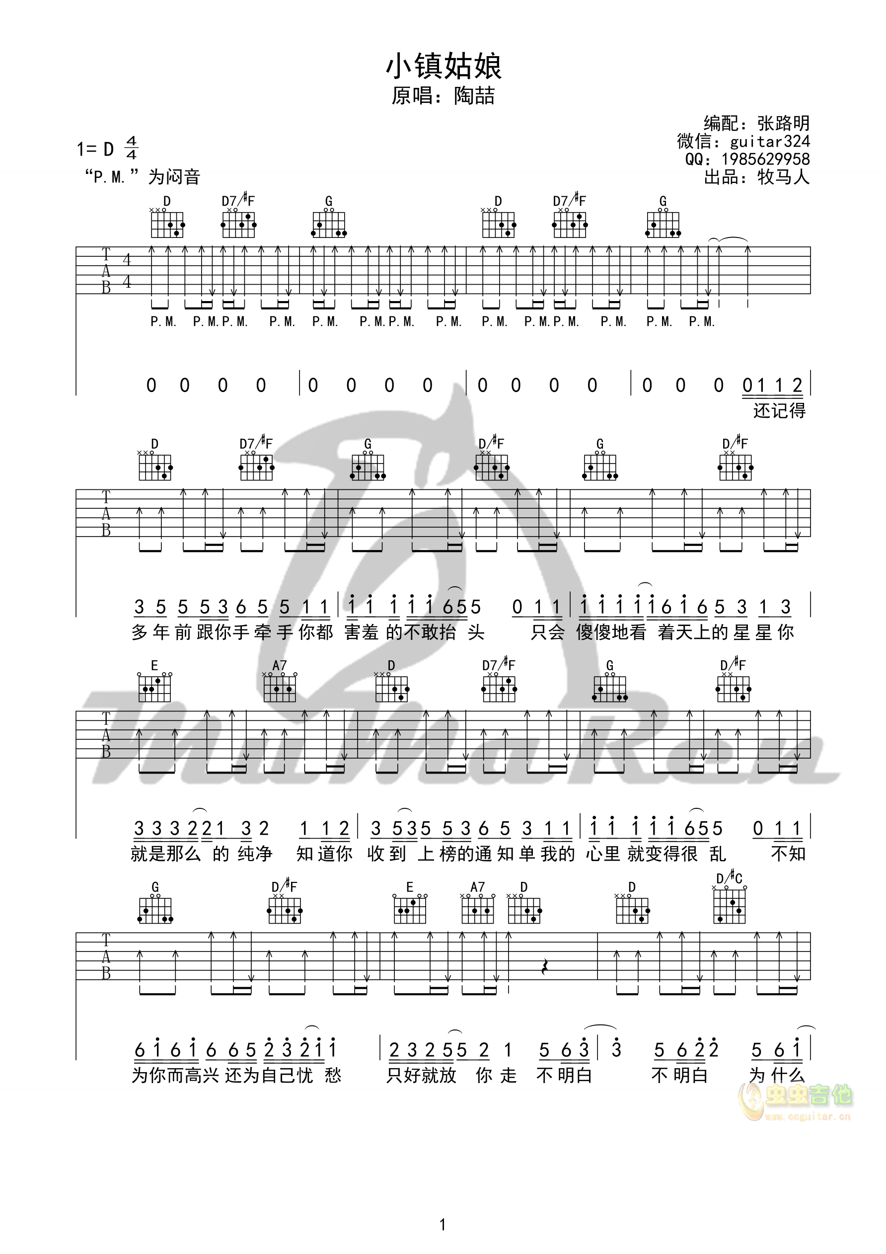 陶喆《小镇姑娘》吉他谱,律动性很强的一首歌曲,对于初学者来难度主要在于去把握节奏,学会会是一大突破,来自牧马人编配高清D调六线谱。...