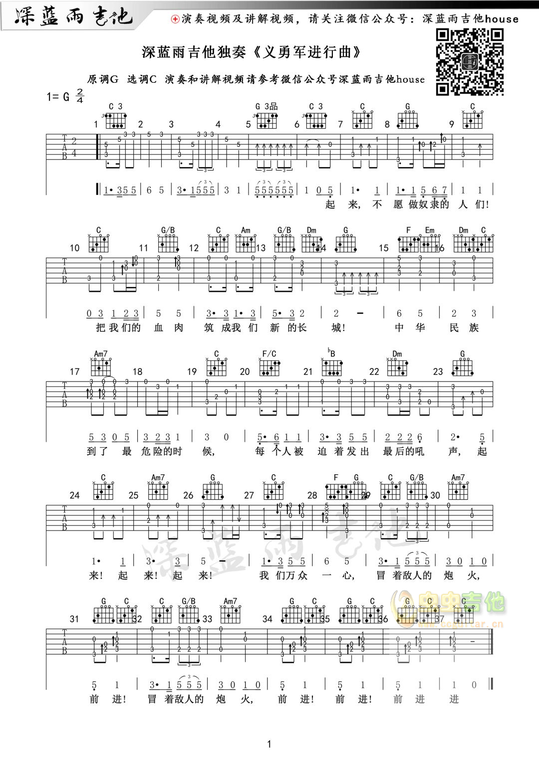 这首国歌独奏《义勇军进行曲》吉他弹唱谱是由深蓝雨吉他编配并分享的吉他谱,谱子是C调图片吉他谱,原调为G调,吉他谱调为C调指法,节拍为4/4拍。...