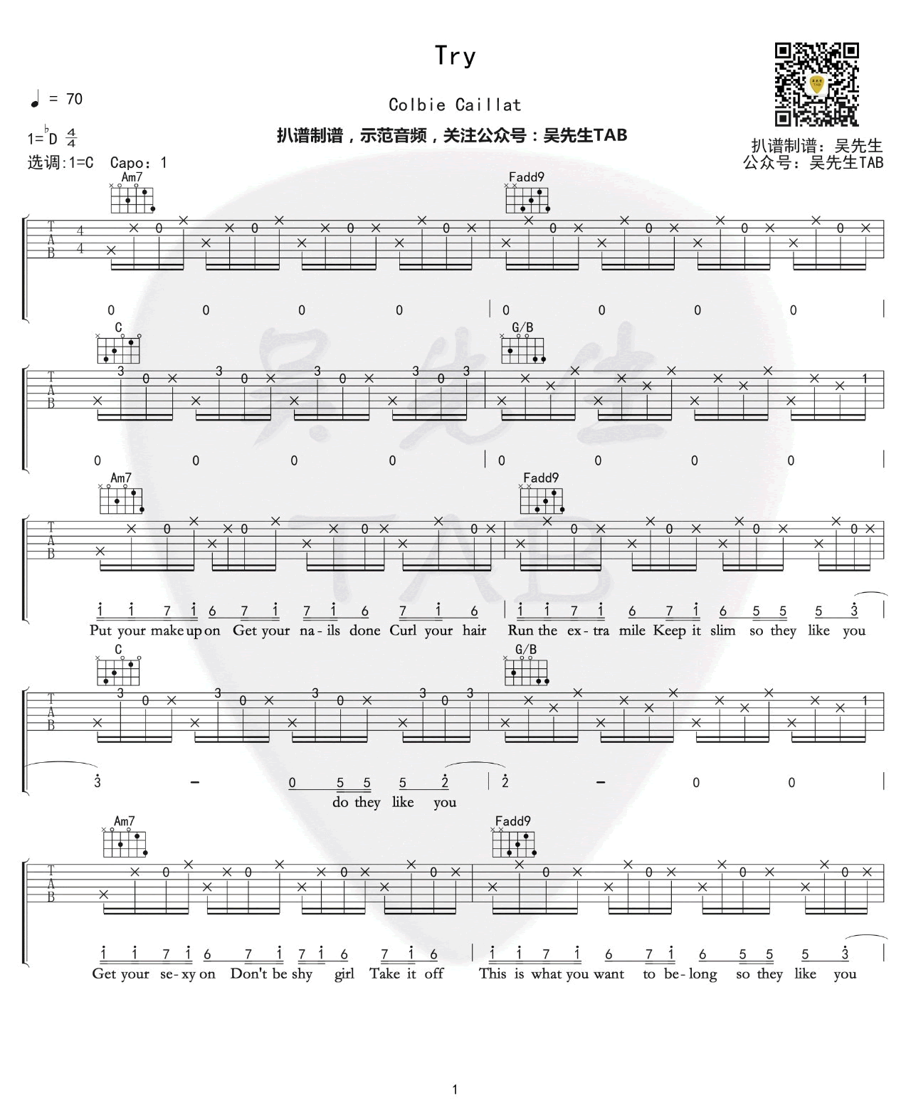 Try吉他谱,美国流行女歌手ColbieCaillat的一首英文歌曲,Try六线谱,原调bD,选用C调指法,CAPO夹一品,完整版共六张高清图片谱。吴先生编配制谱...