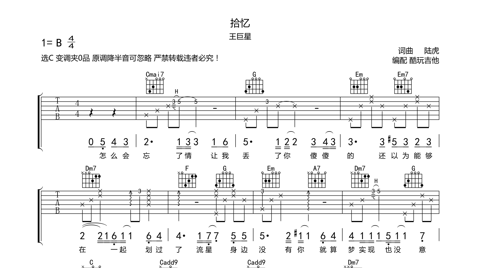 吉他拾忆 吉他谱 王巨星 C调编配 木吉他版