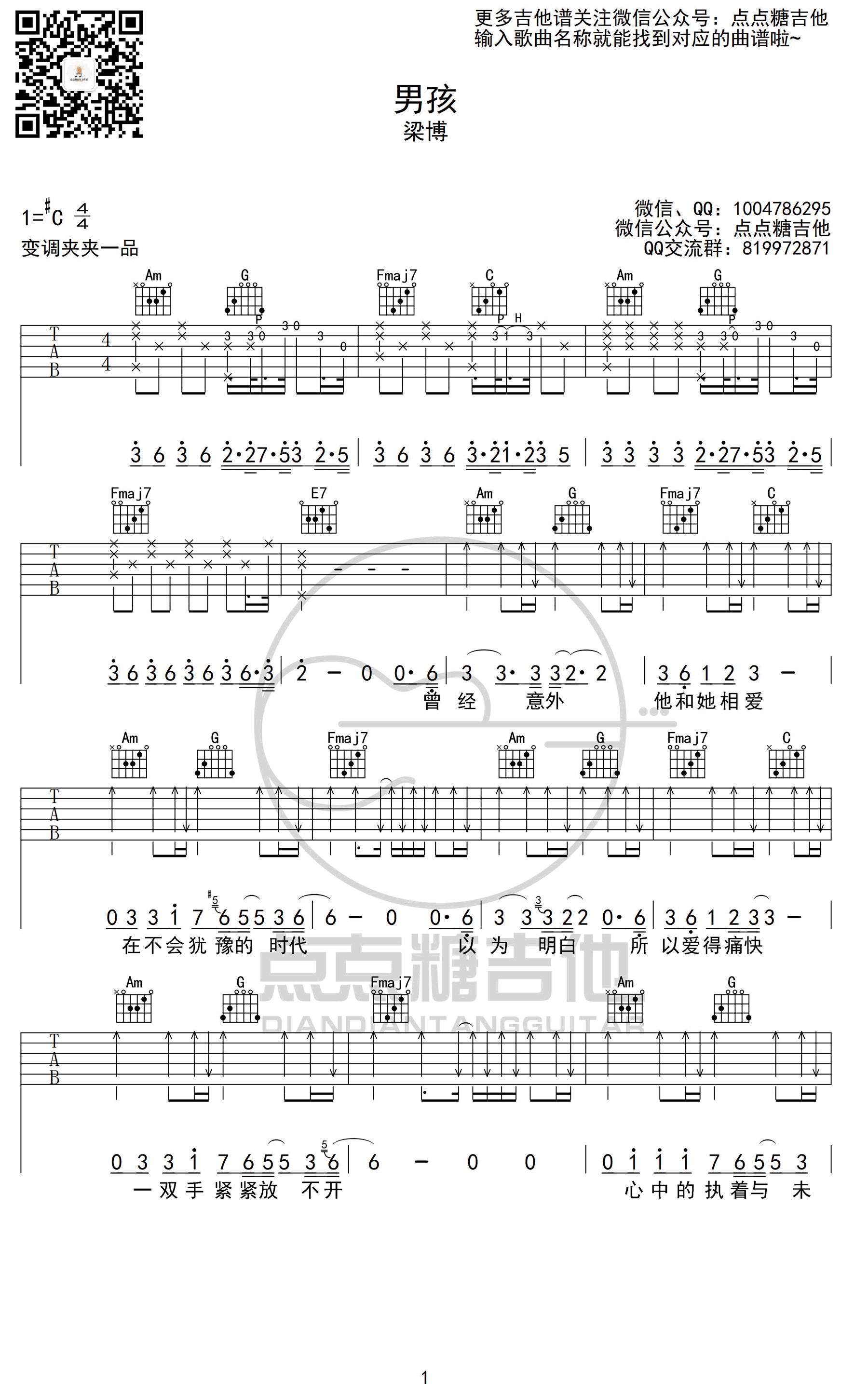 《男孩》吉他谱,梁博在《我是歌手》上所演唱的版本男孩六线谱,原调#C调,C调指法编配,变调夹夹在吉他的1品位置。感谢点点糖吉他编配...