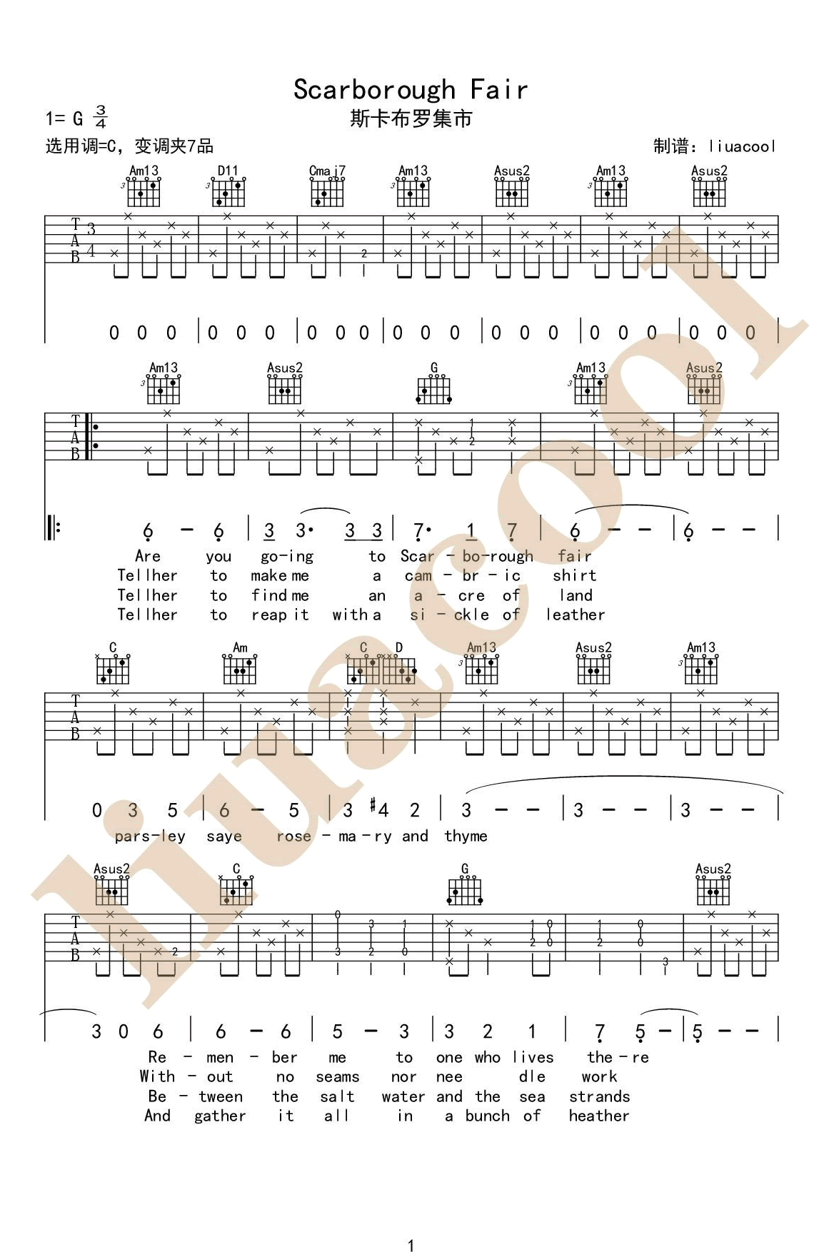 ScarboroughFair吉他谱,一首旋律优美的经典英文歌曲,原调G调,此谱采用C调指法,变调夹夹7品。斯卡布罗集市吉他谱,美国电影《毕业生》主题曲,保罗·西蒙(PaulSimon)和阿特·加芬克尔(ArtGarfunkel)演唱。liuacool制谱分享...