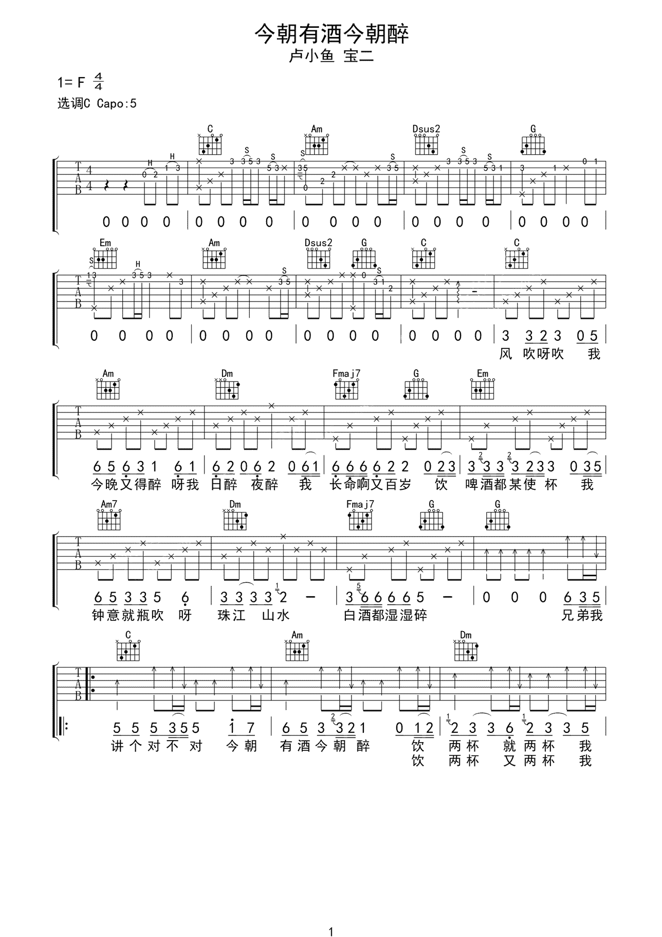 今朝有酒今朝醉吉他谱,演唱:卢小鱼,宝二,原调:F,变调夹夹5品,选C和弦指法编配。...