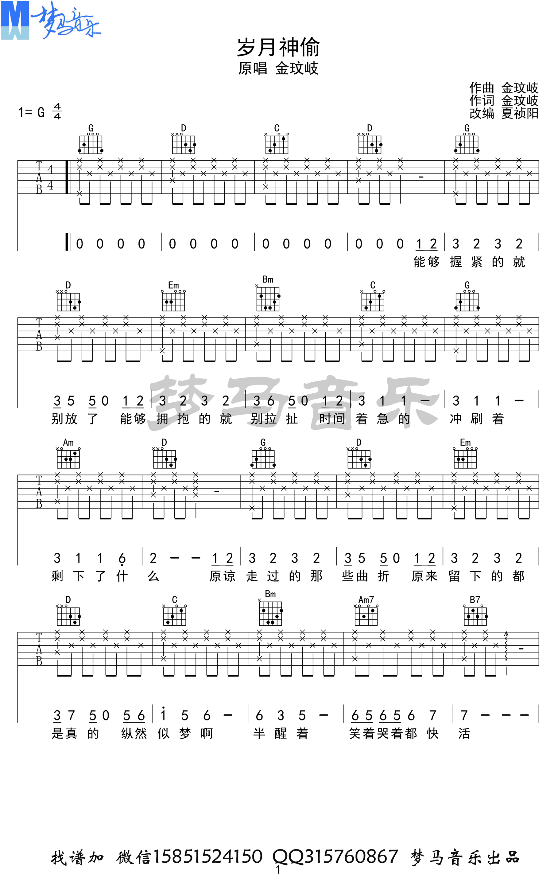 《岁月神偷》吉他谱,G调编配,金玟岐的一首代表作品,岁月神偷六线谱,完整版共四张高清图片谱,感谢梦马音乐编配出品...