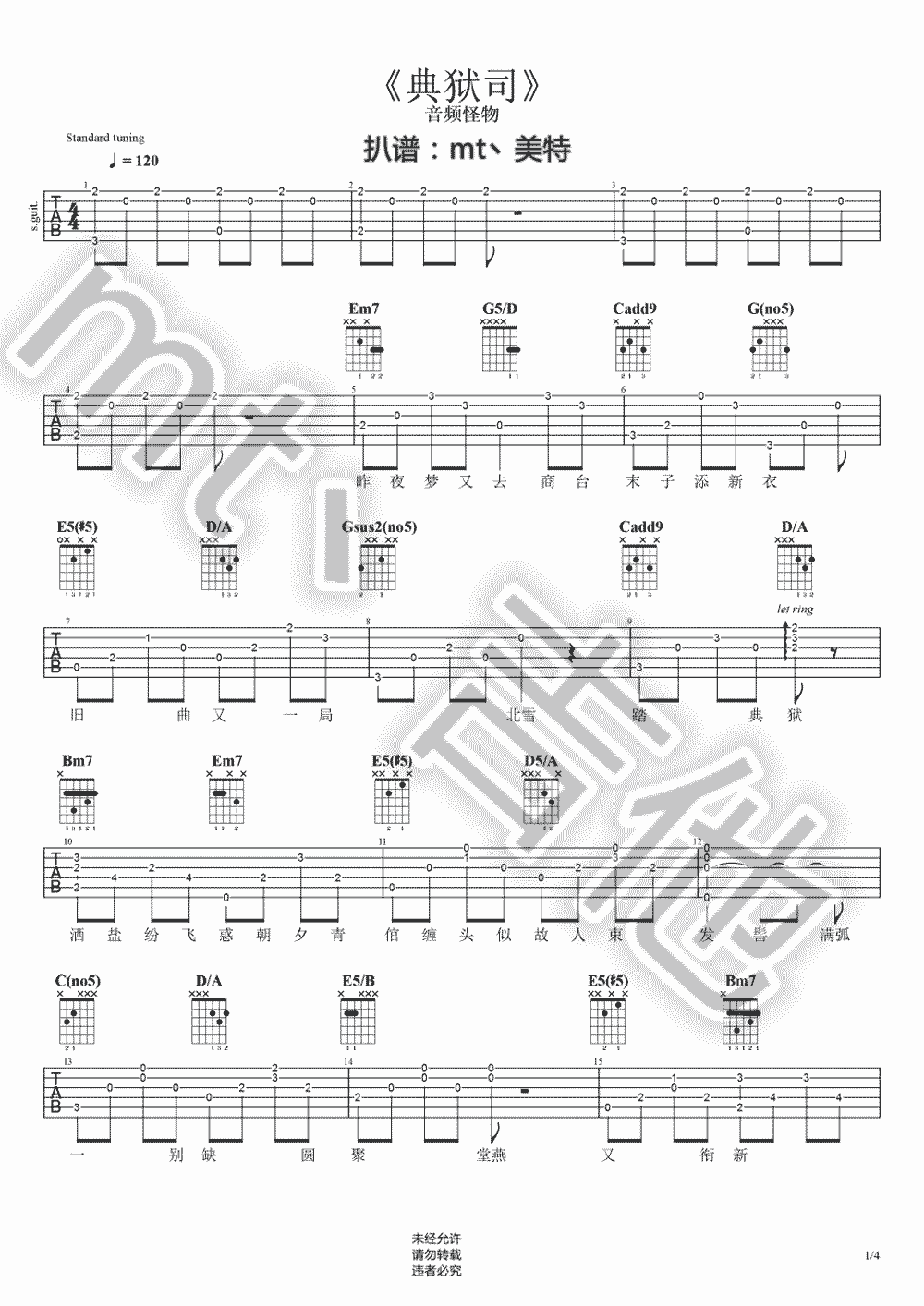 典狱司吉他谱,曲谱选原调:1=G和弦指法编配,和弦谱和六线谱两个版本,谱子一共5页。音频怪物典狱司吉他弹唱谱...