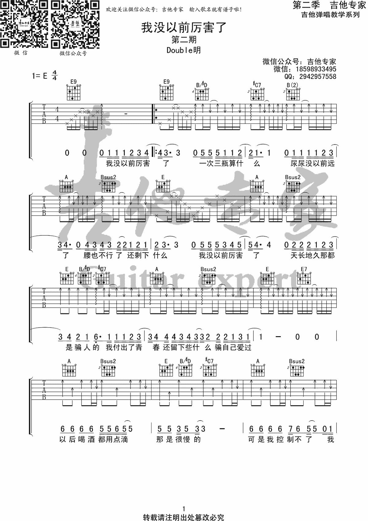 我没以前厉害了吉他谱,曲谱选原版原调:1=E和弦指法编配。double明我没以前厉害了吉他弹唱谱,谱子共有3页图片六线谱。...