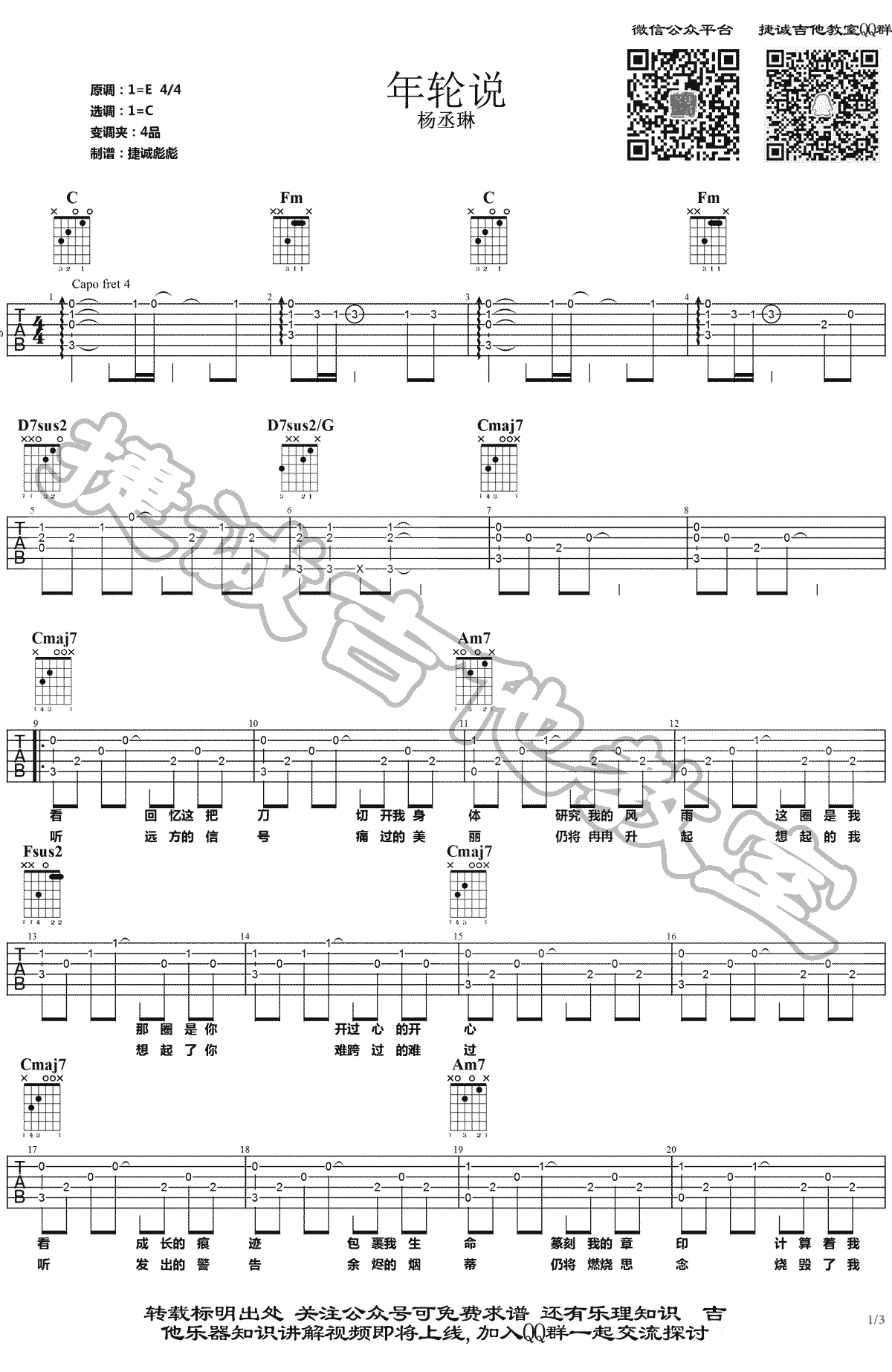 年轮说吉他谱,原调:E,变调夹夹4品,采用C和弦指法编配,谱子共3页图片六线谱。...
