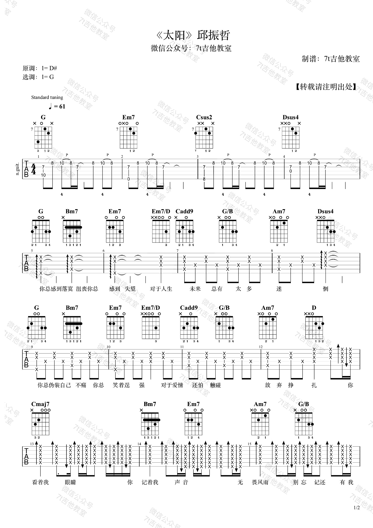 《太阳》吉他谱,邱振哲演唱,这首歌的原调是D#大调,这里用的是G大调的指法来编配,视频里是标准音调弦,没有用变调夹,适合音域较低的男生。...