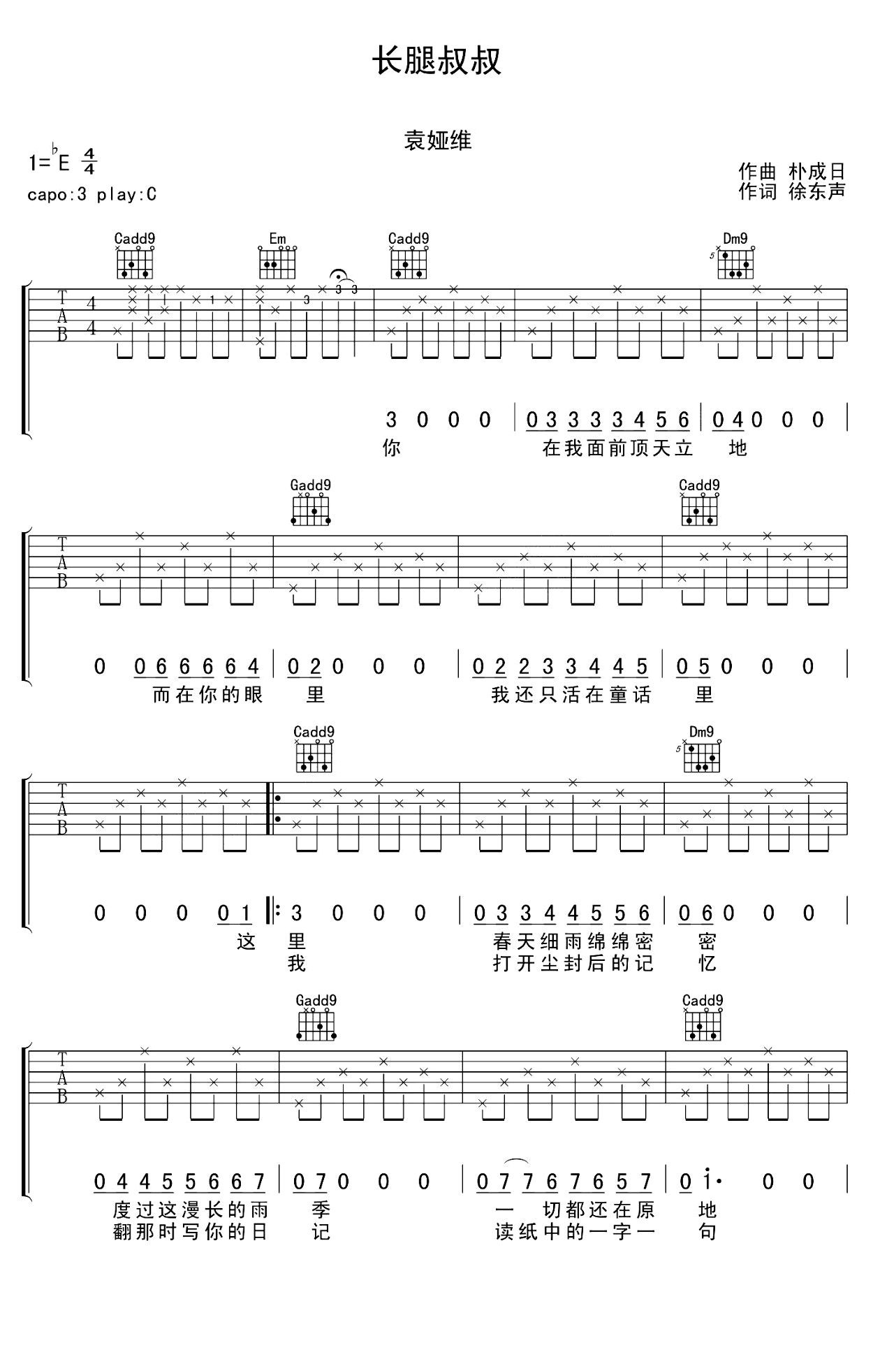 长腿叔叔》吉他谱,袁娅维演唱,韩合拍网剧《老师晚上好》的中文主题曲,长腿叔叔六线谱,原调bE,capo夹三品,选用C调指法...