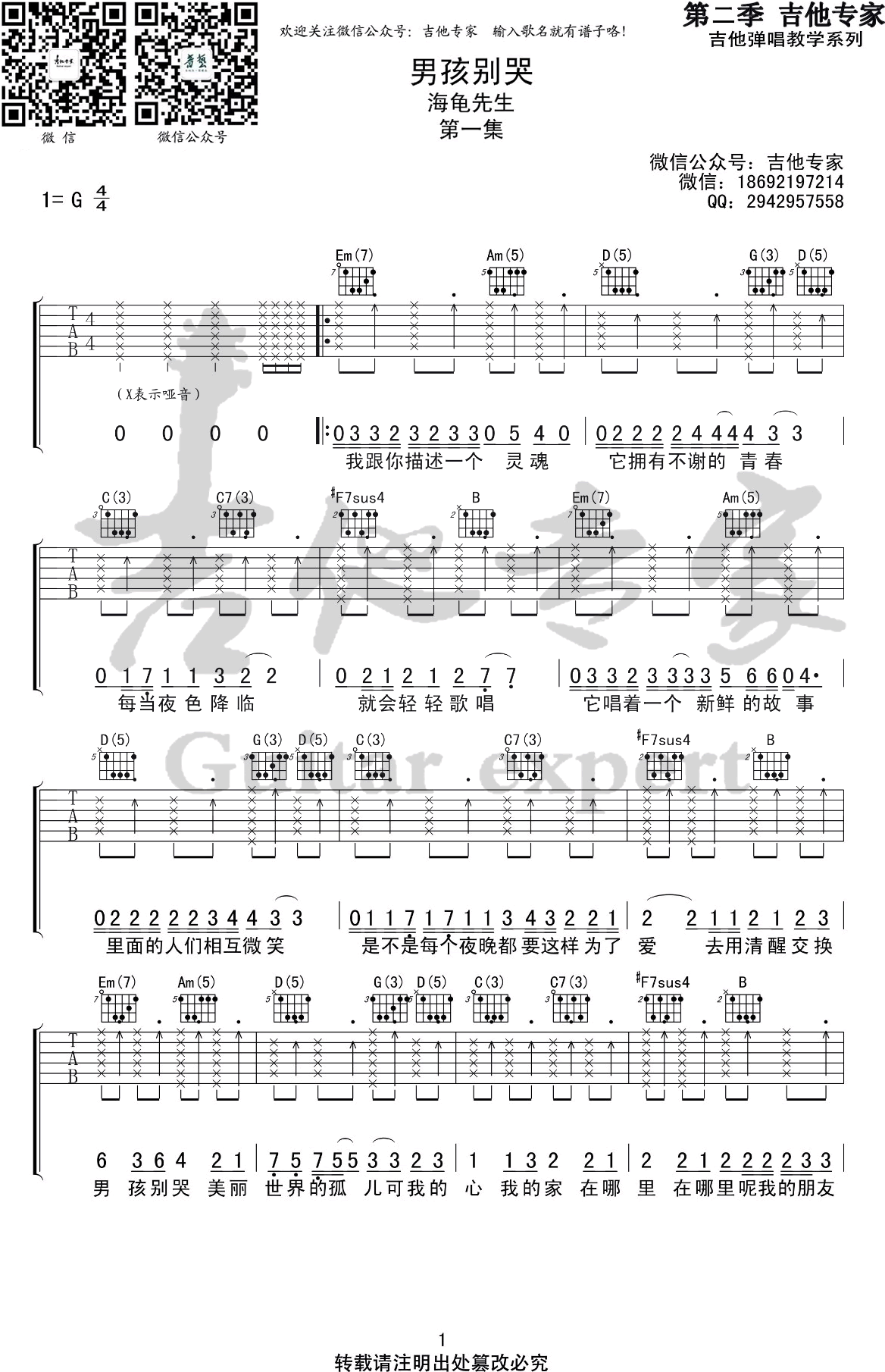 男孩别哭》吉他谱,中国内地摇滚乐队海龟先生演唱,乐队的夏天歌曲,男孩别哭六线谱,G调弹唱谱,完整版共五张图片谱例。吉他专家编配出品...