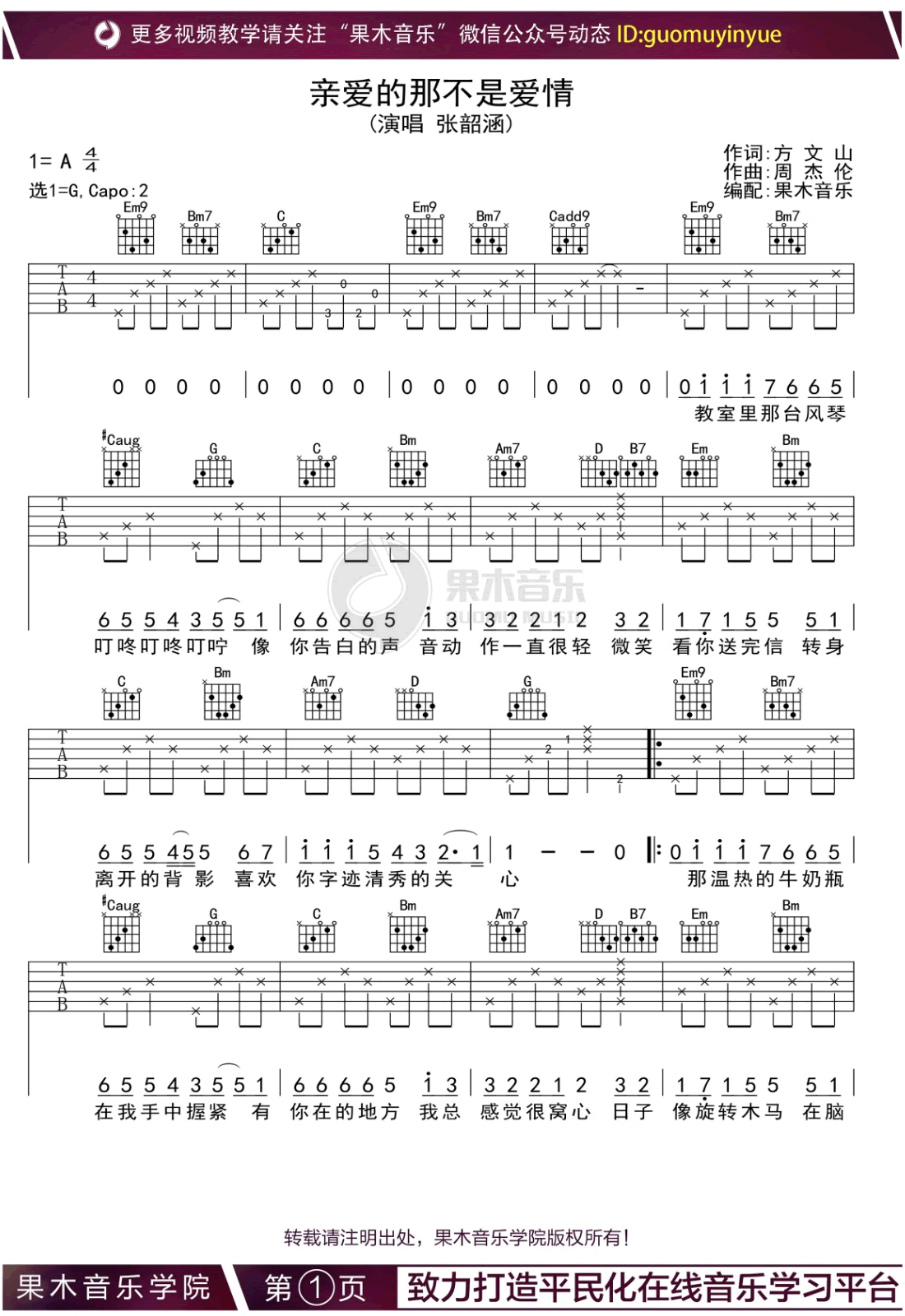 亲爱的那不是爱情吉他谱,张韶涵演唱,一首由周杰伦为张韶涵特地量身打造经典老歌,亲爱的那不是爱情六线谱,原调A,选用G调指法,变调夹夹第二品,果木音乐编配出品...