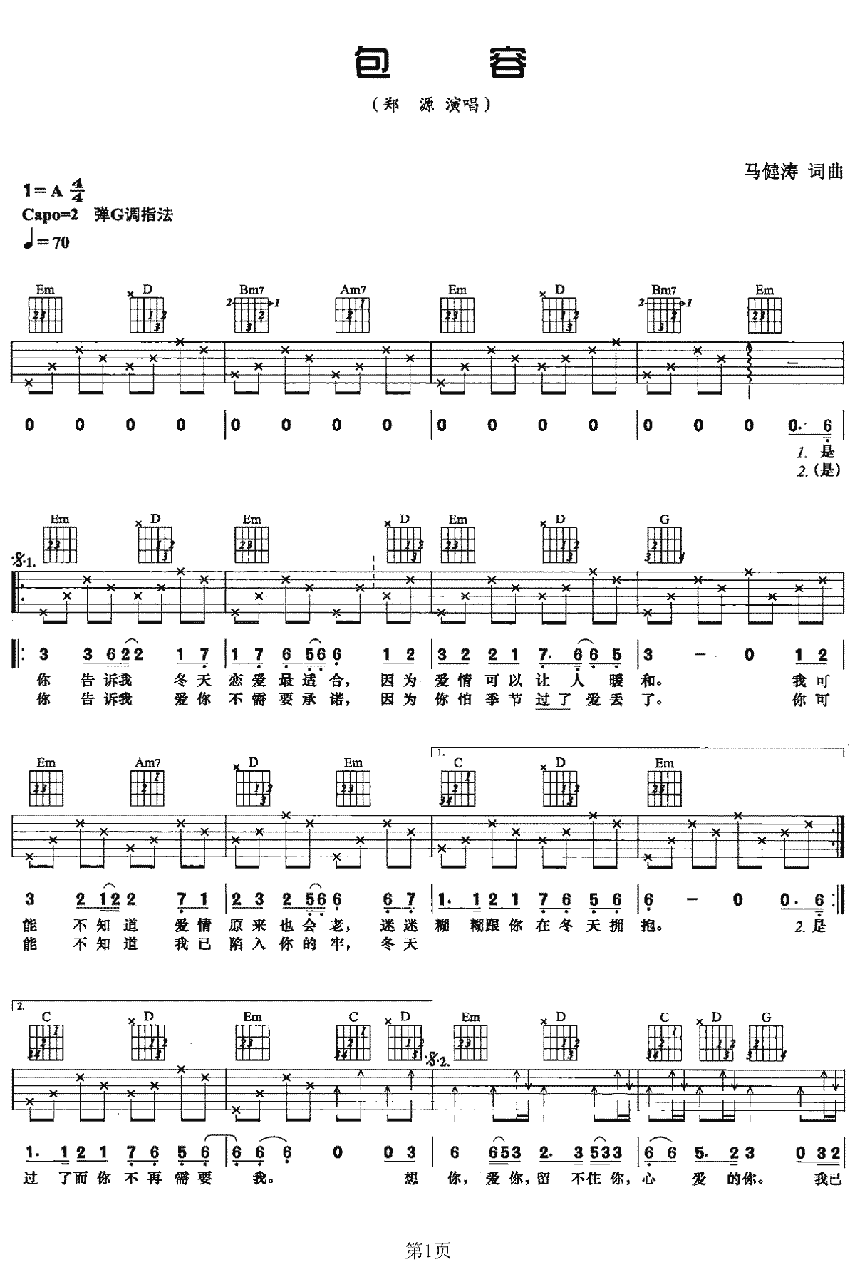 包容吉他谱,原调:1=A,CAPO:2品,弹G调和弦演唱。郑源包容吉他弹唱谱,谱子一共2页图片六线谱。...