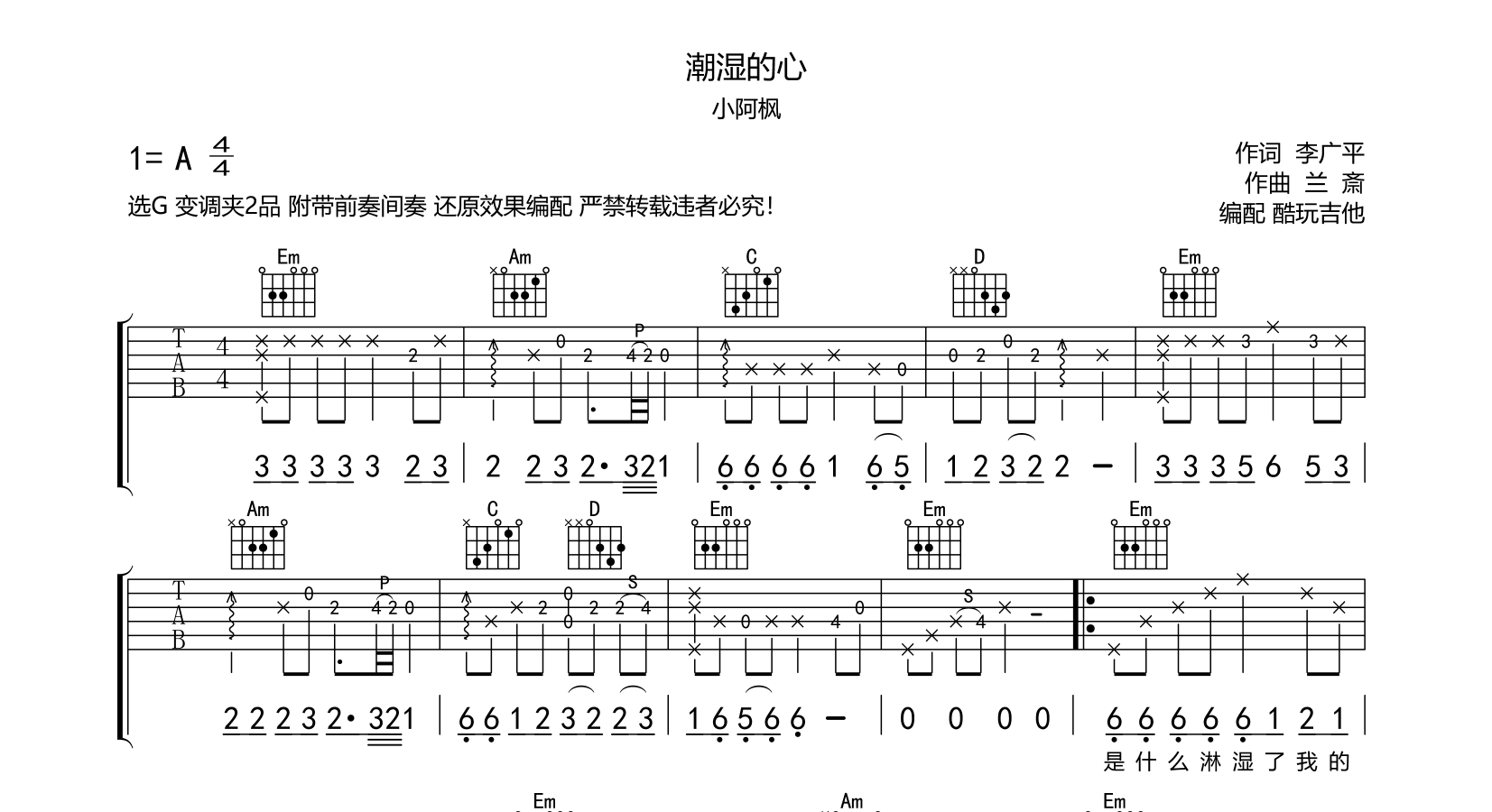 吉他潮湿的心 吉他谱 小阿枫 附带完整前奏间奏