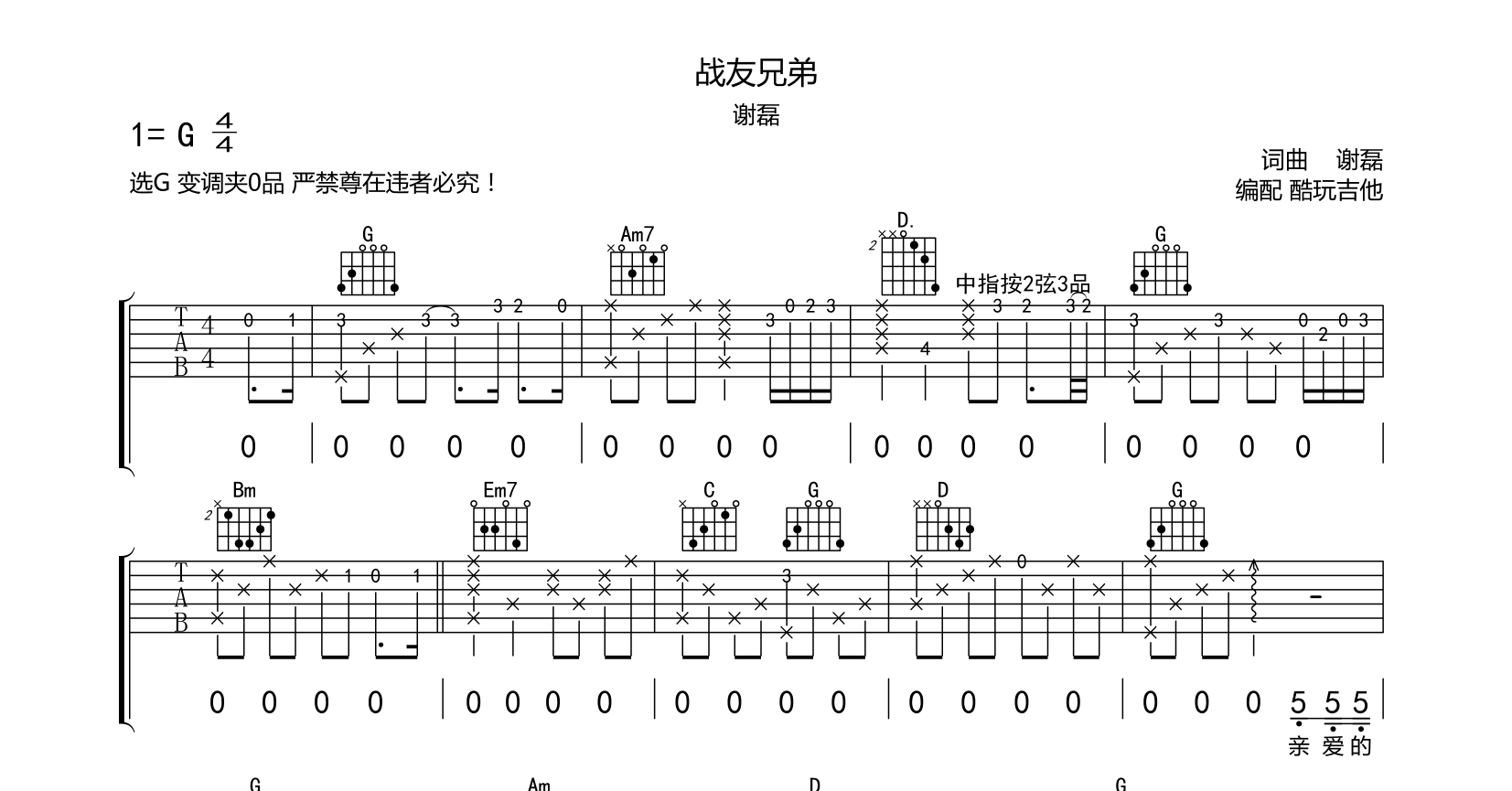 吉他战友兄弟 吉他谱 谢磊 琴友订制