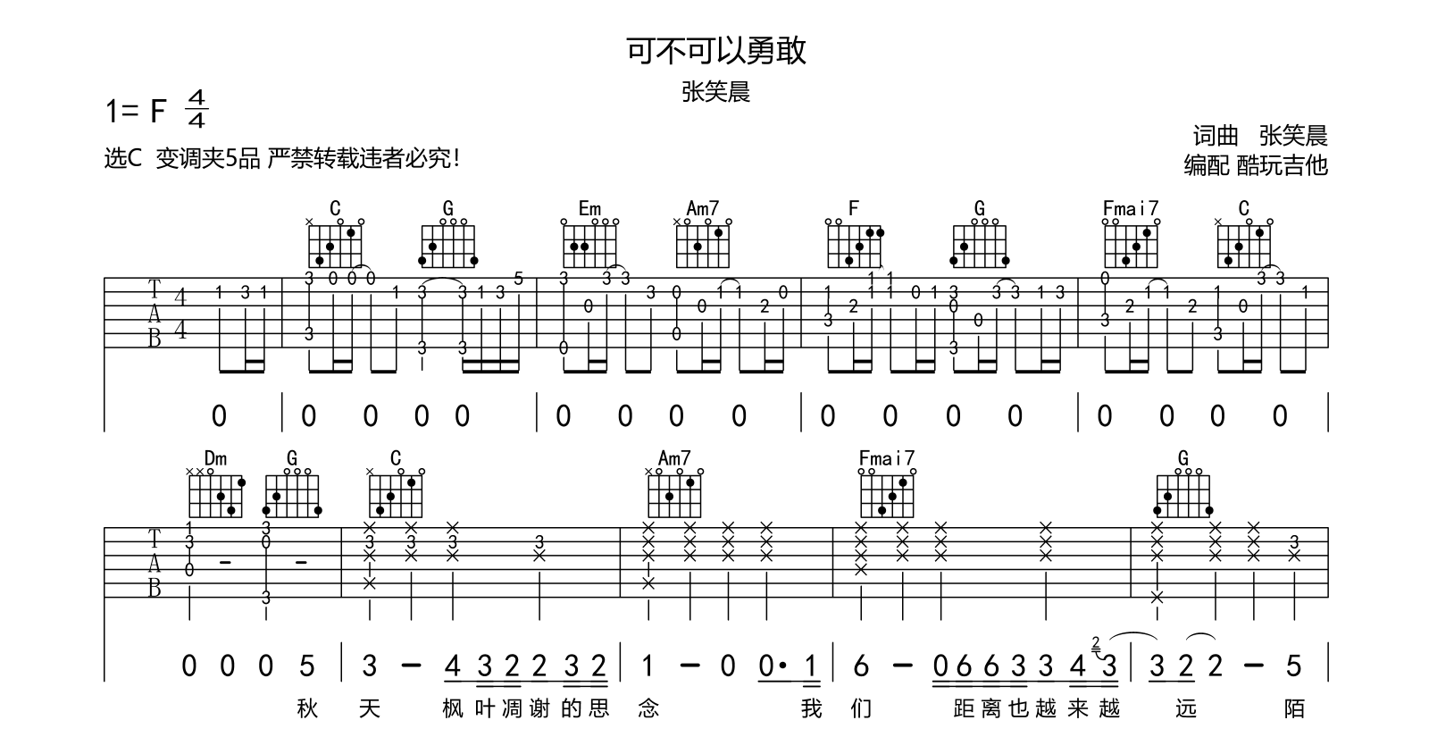吉他可不可以勇敢 吉他谱 张笑晨 还原版琴友定制