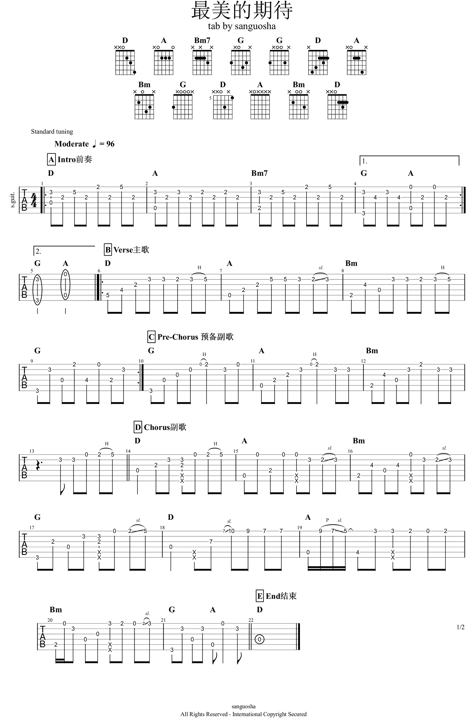 最美的期待指弹谱,周笔畅演唱的一首代表歌曲,最美的期待吉他独奏谱,高清图片谱,sanguosha编配制谱...