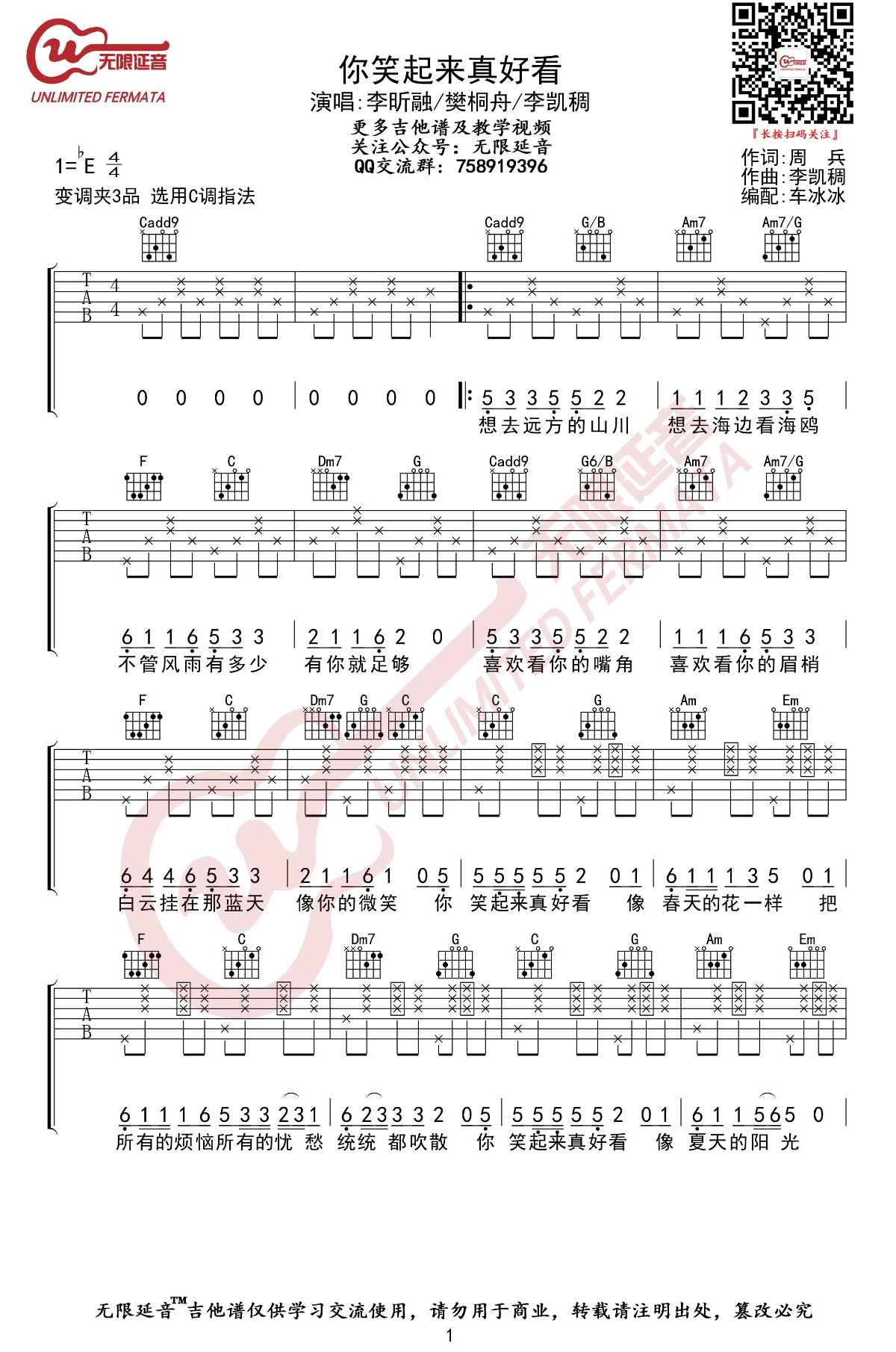 你笑起来真好看吉他谱,一首抖音热门歌曲,你笑起来真好看六线谱,原调降E,变调夹夹三品,选用C调指法。无限延音编配分享...