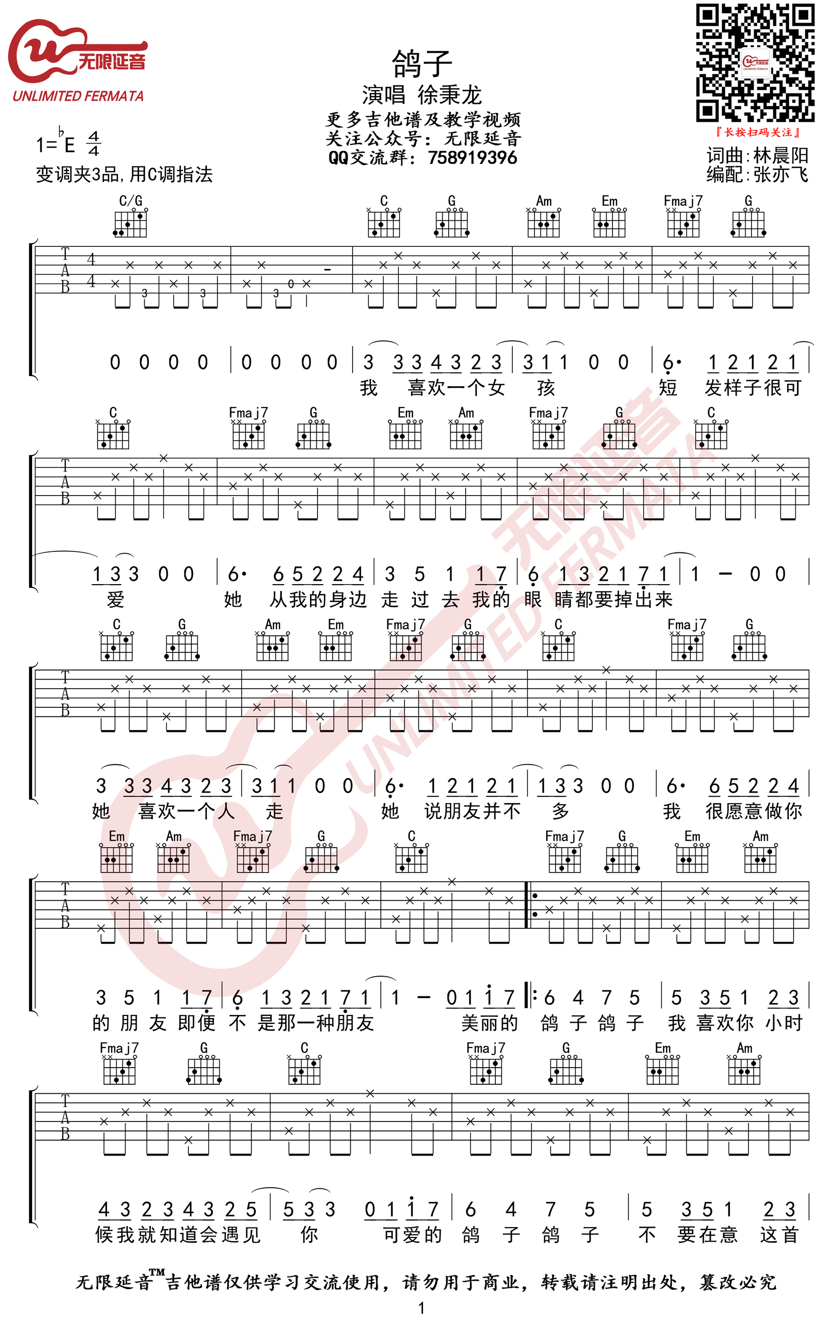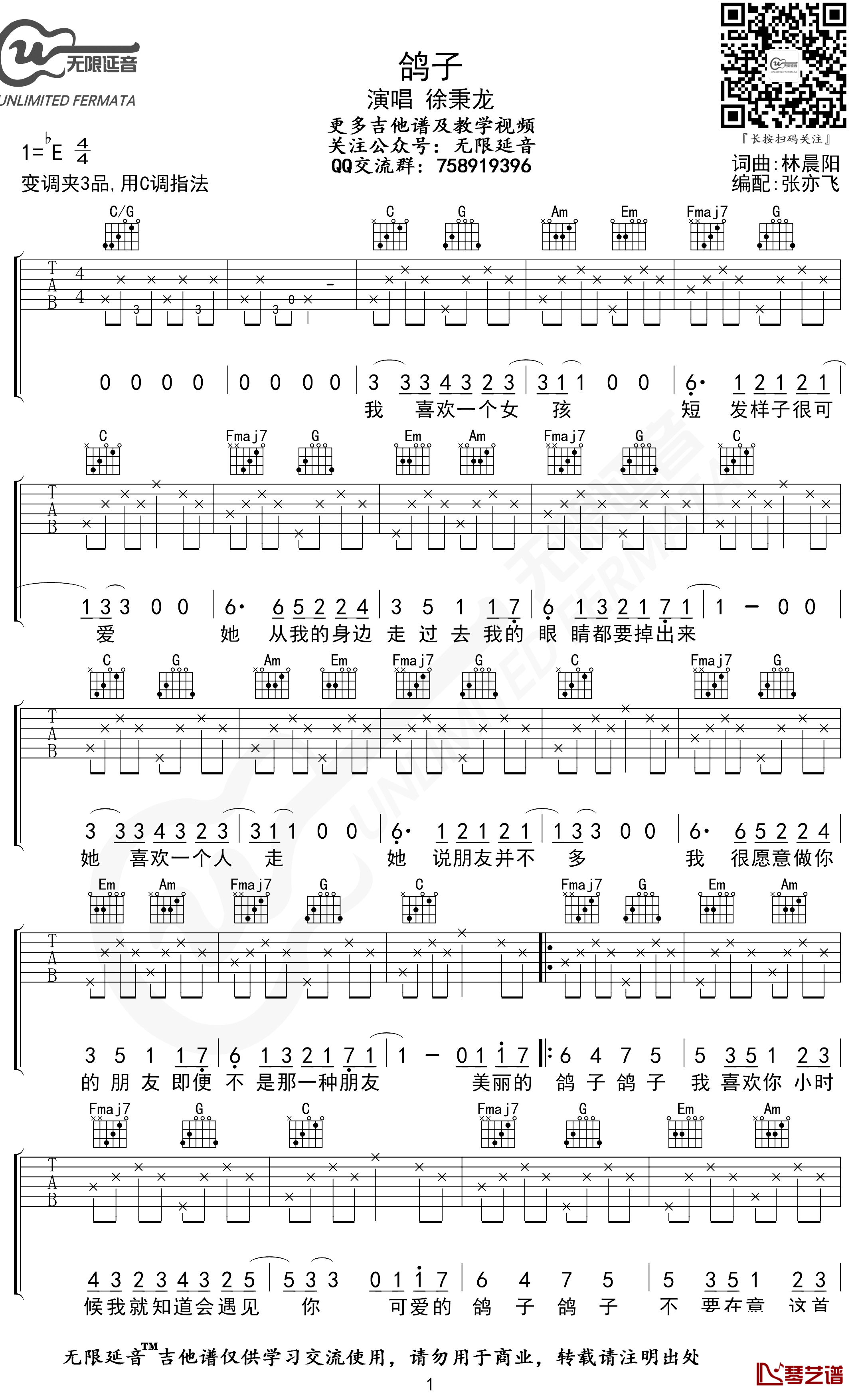 吉他鸽子吉他谱_徐秉龙_C调六线谱_弹唱谱高清版