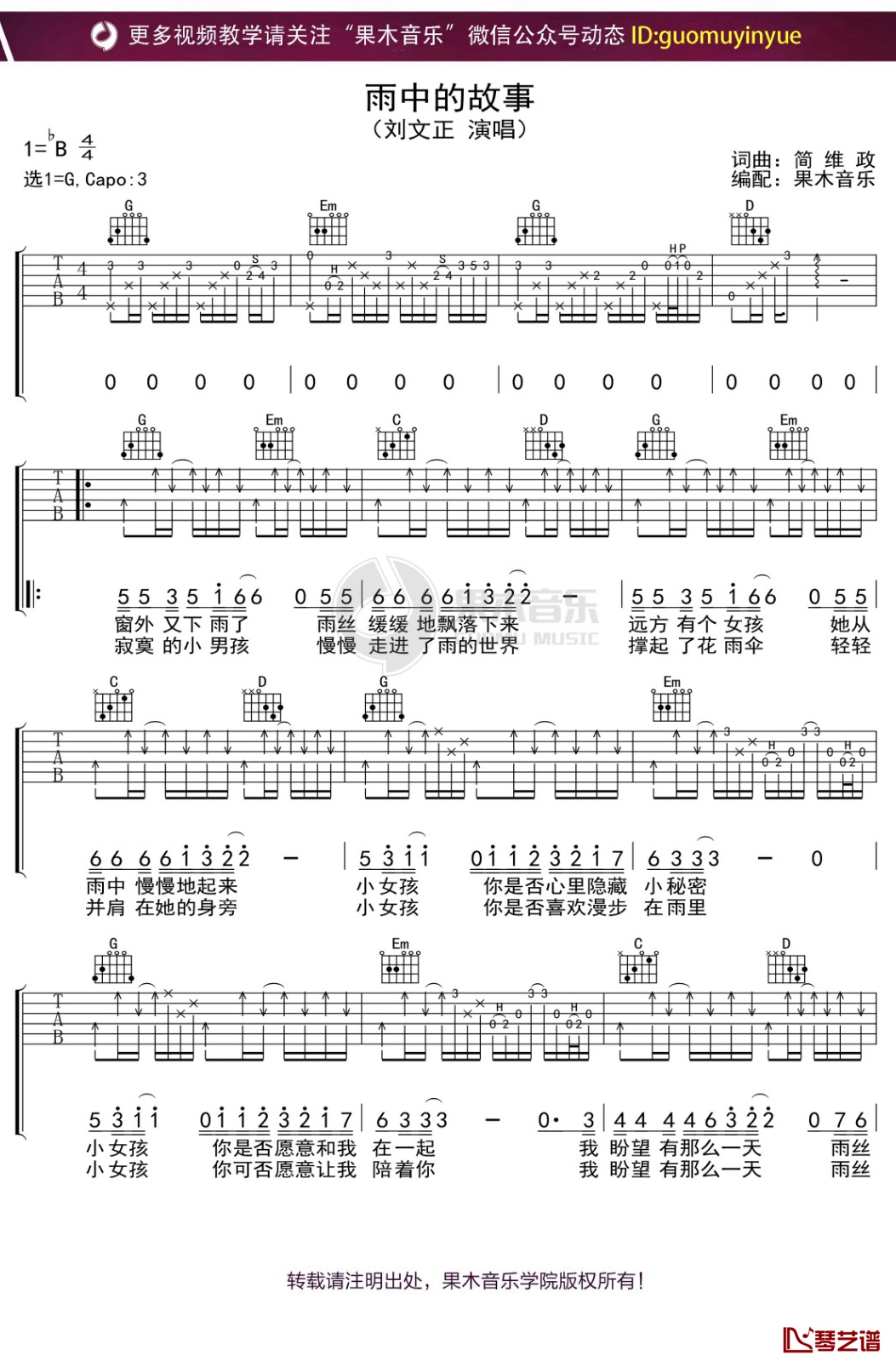 吉他刘正文《雨中的故事》吉他谱 G调弹唱六线谱