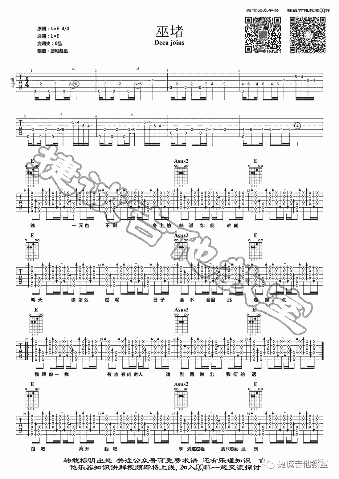 巫堵吉他谱,选E调和弦指法编配,一共两页图片六线谱。decajoins巫堵吉他弹唱谱...