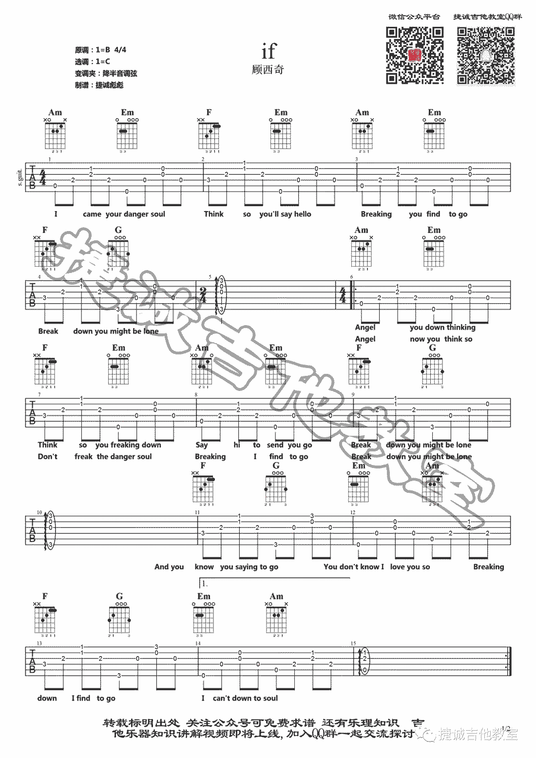 if吉他谱,原调:B,选C和弦指法编配,如果想要原调演唱请降半音调弦。顾西奇if吉他弹唱谱...