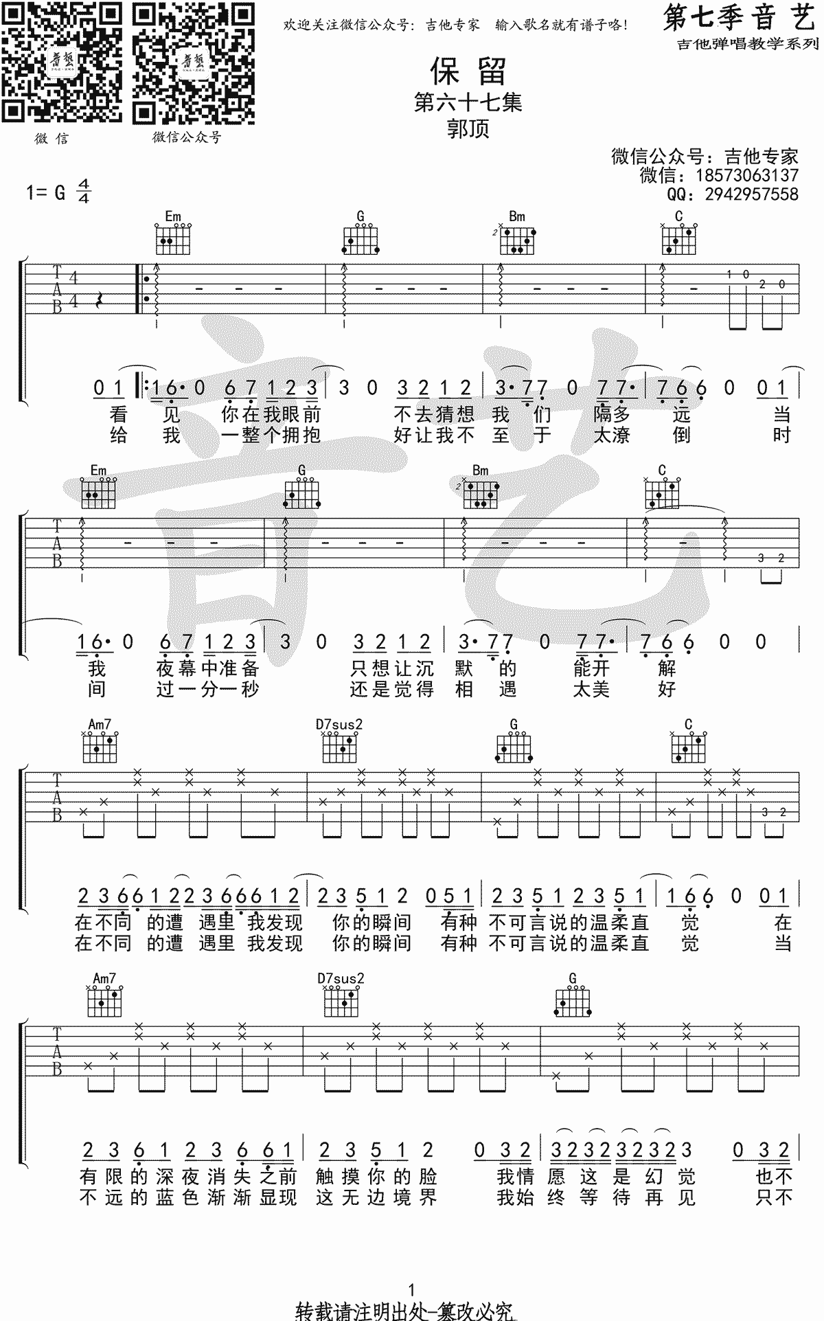 保留吉他谱,本站提供D和G和弦编配的两个版本谱子给大家,一共5页图片六线谱,郭顶保留吉他弹唱谱...