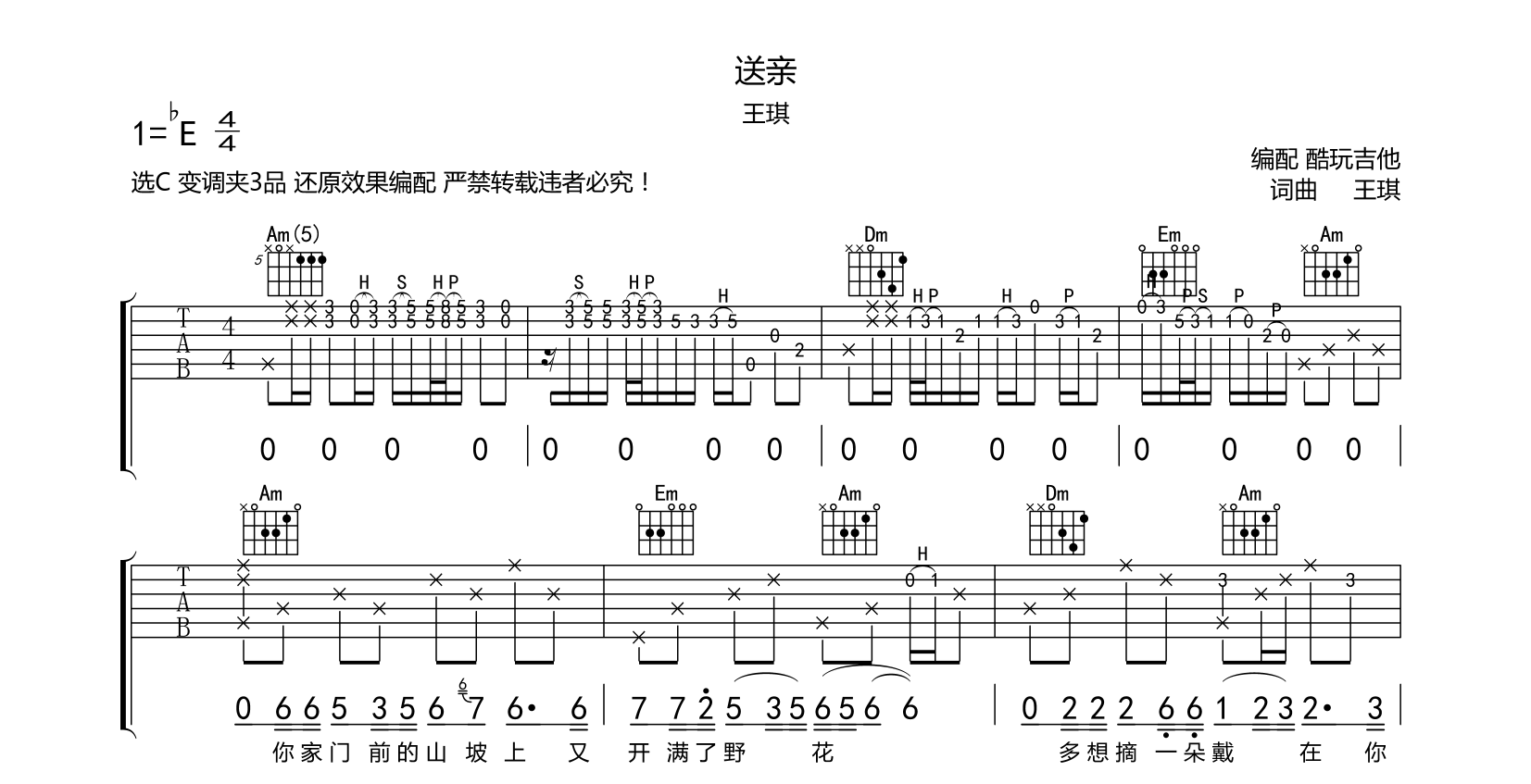 吉他送亲 吉他谱 王琪最新单曲 还原版附前奏间奏尾奏