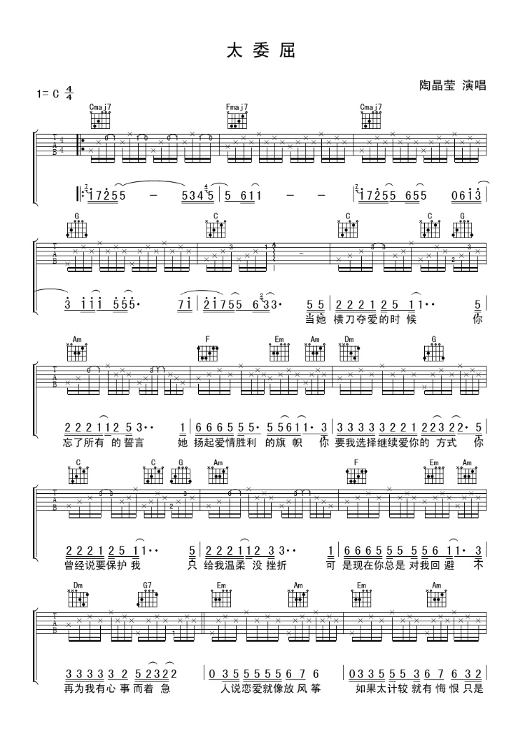 吉他陶晶莹《太委屈》吉他谱 C调弹唱谱