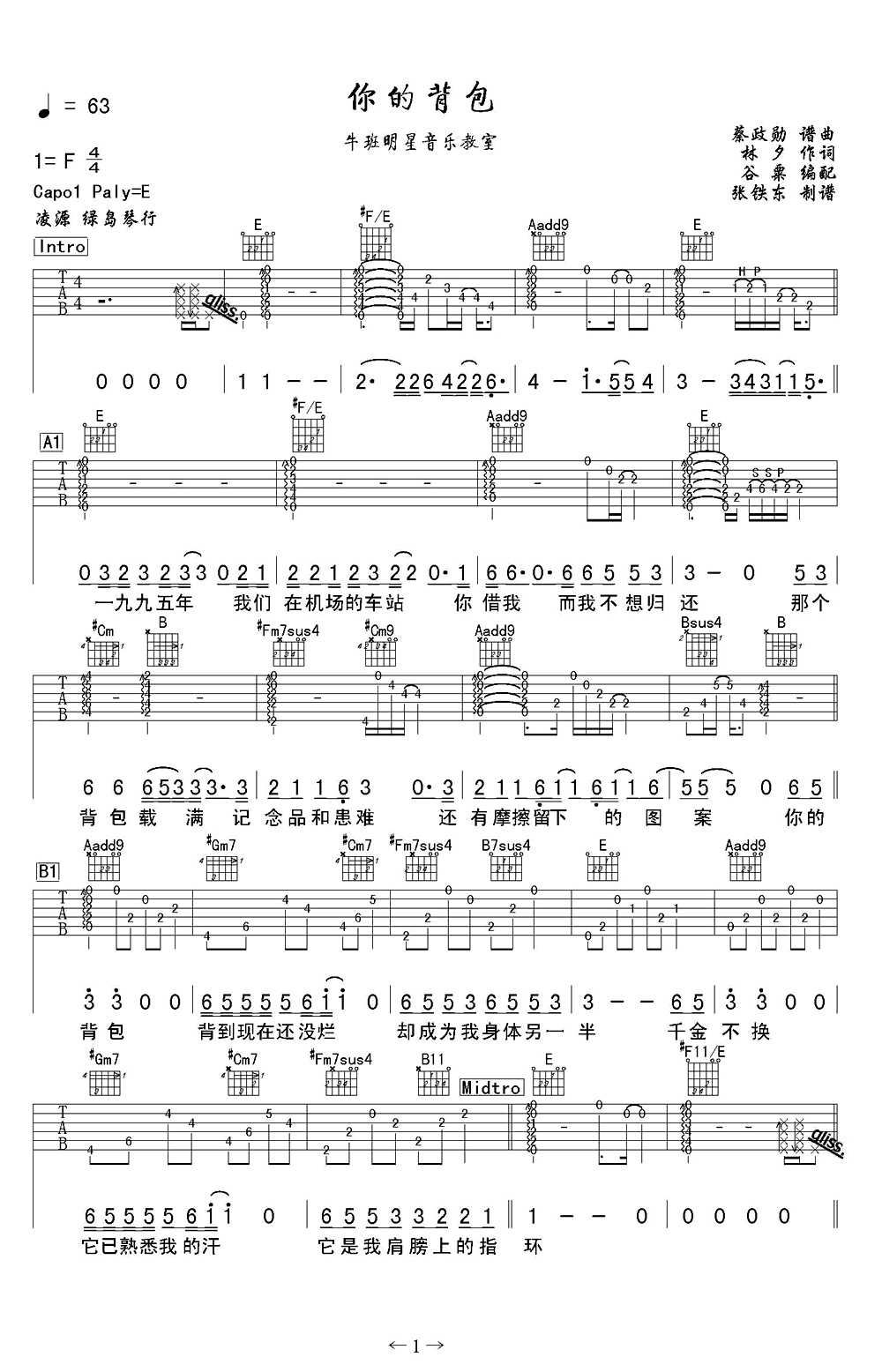 你的背包吉他谱,附吉他弹唱教学示范讲解,原调Fcopa夹一品选用E调指法,你的背包吉他六线谱,图片谱感谢绿岛琴行谷粟老师编配张铁东制谱。...