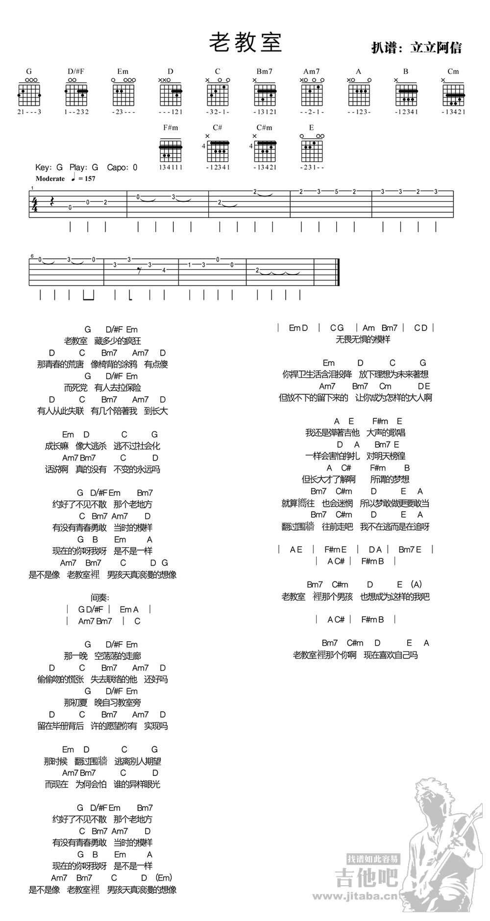 八三夭老教室吉他谱,G调编配,老教室吉他弹唱图片谱。立立阿信扒谱,一首《老教室》...