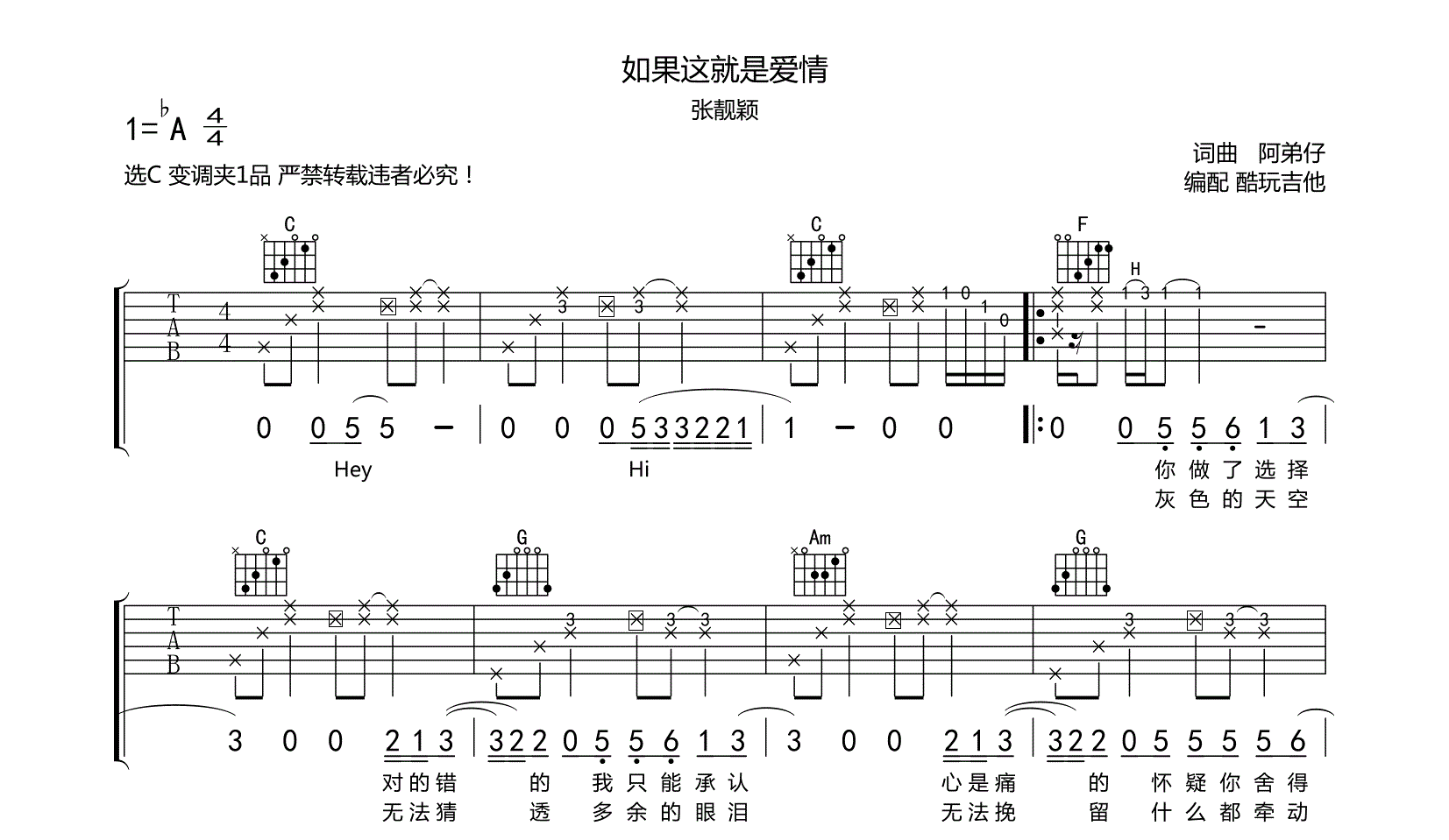 吉他如果这就是爱情 吉他谱 选C 张靓颖
