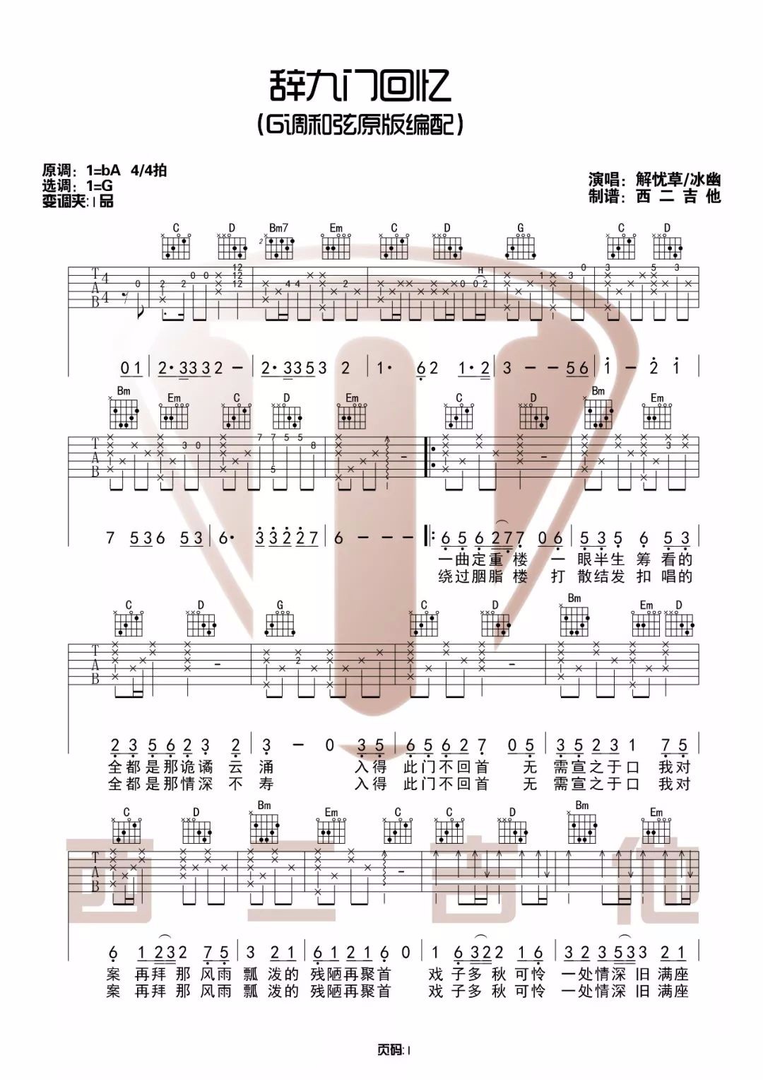 《辞九门回忆》吉他谱_解忧草/冰幽_G调原版弹唱谱选G变调夹1品...