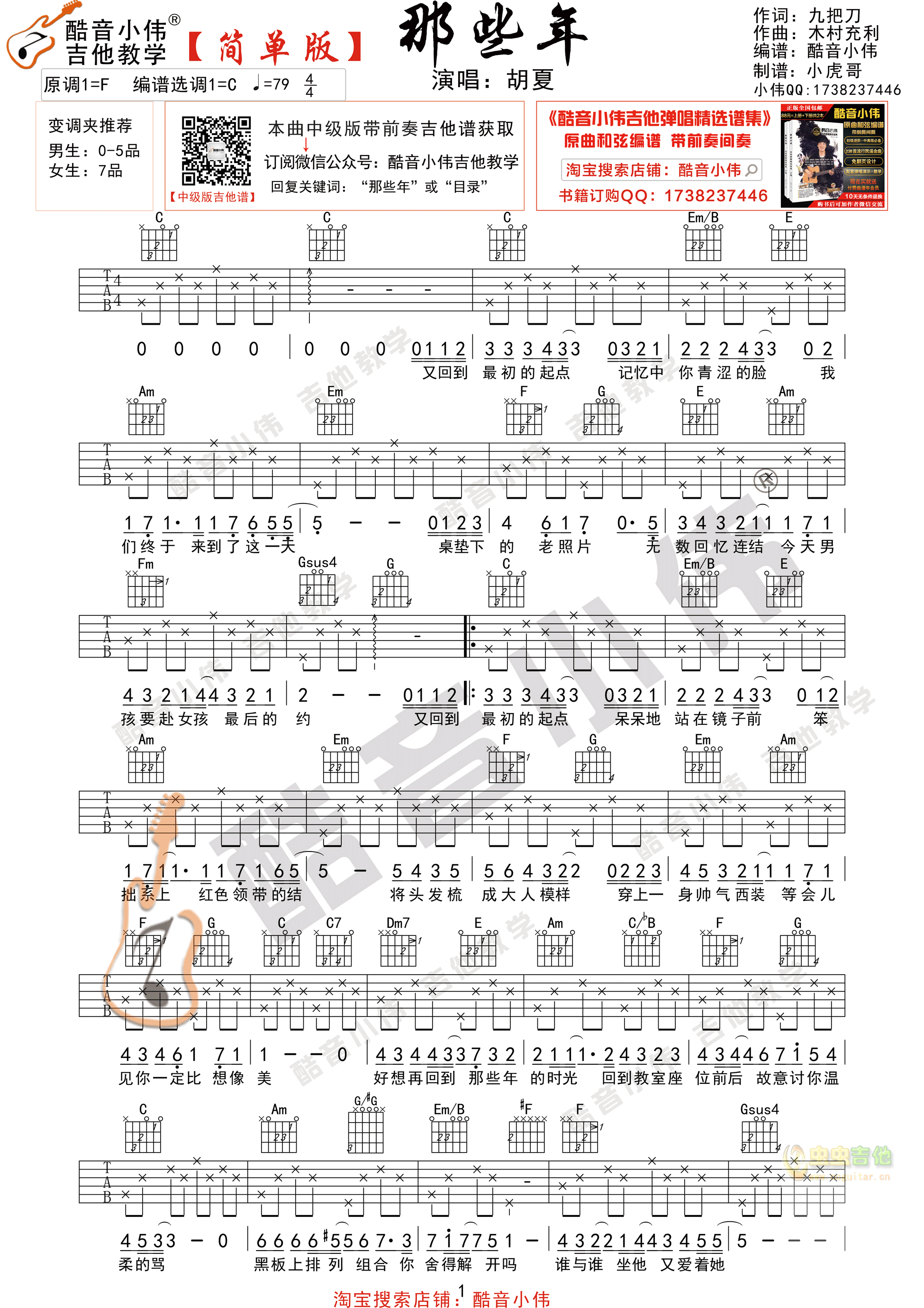 《那些年》胡夏简单版酷音小伟吉他弹唱教学本谱选调:C调Caps:夹五品...