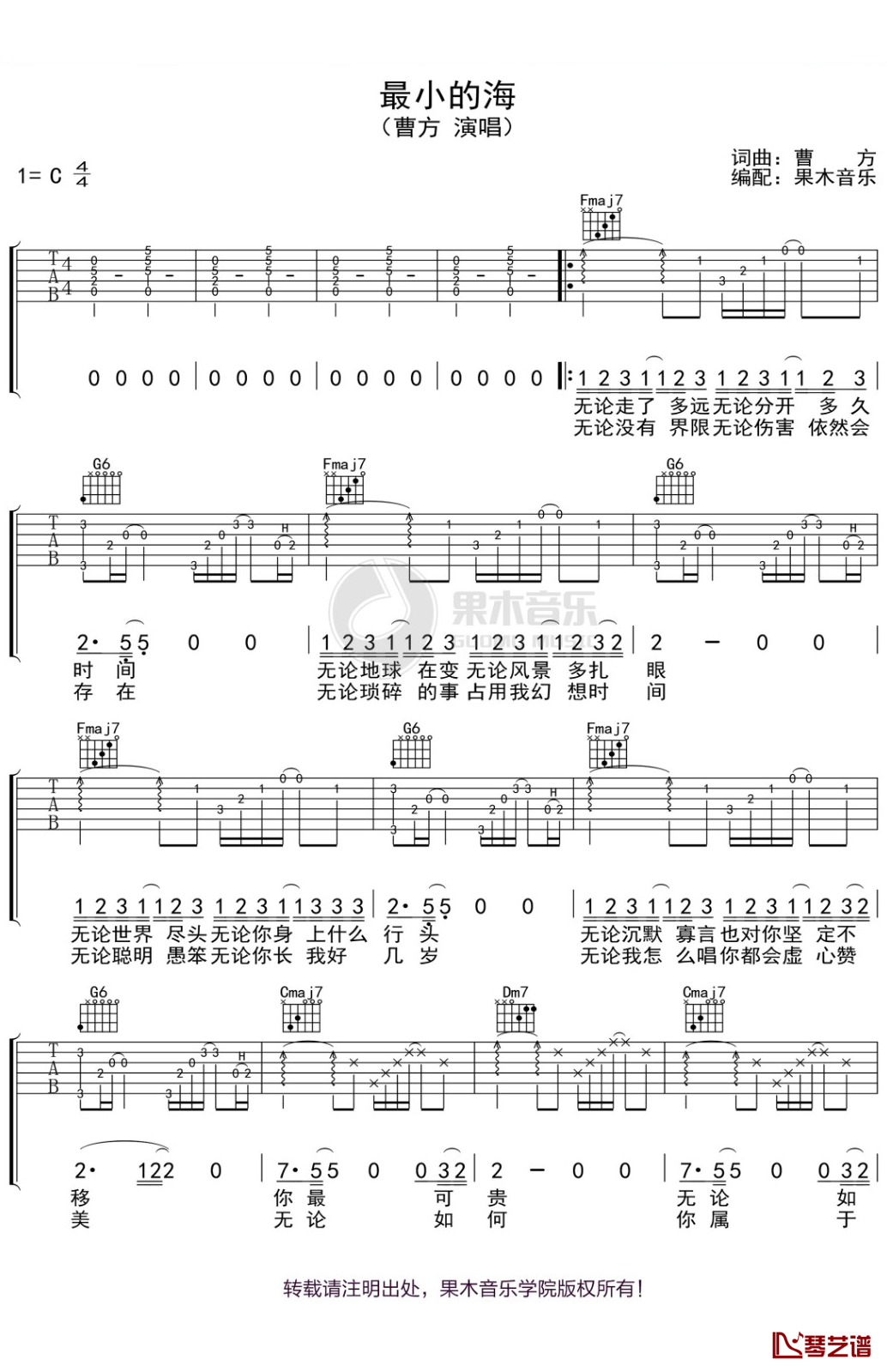 吉他最小的海吉他谱 C调 曹方 弹唱六线谱
