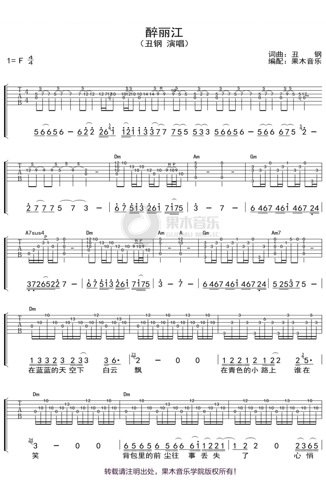 吉他醉丽江吉他谱 丑钢 弹唱六线谱 双吉他谱