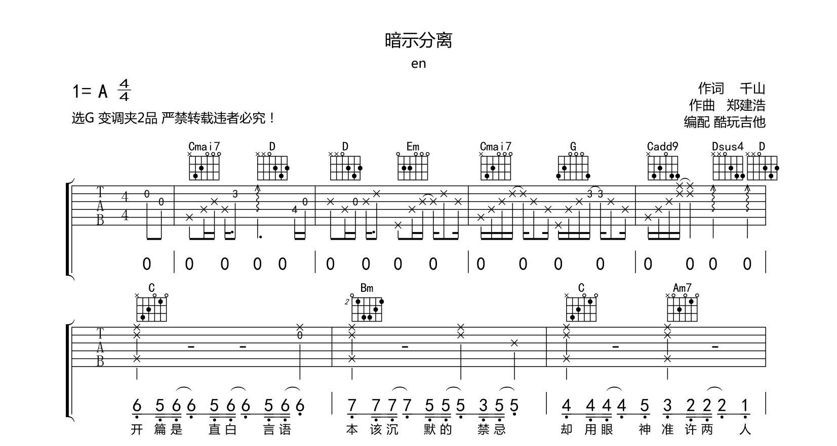吉他暗示分离 吉他谱 en 六线谱弹唱 附前奏