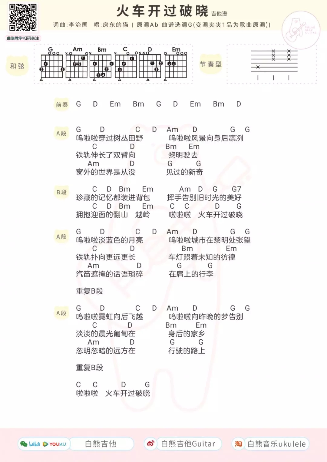 火车开过破晓吉他谱,歌曲原调Ab调,曲谱选用G调,演奏时候变调夹夹1品为歌曲原调,房东的猫最新单曲,附上吉他弹唱谱+尤克里里谱,感谢白熊音乐出品...