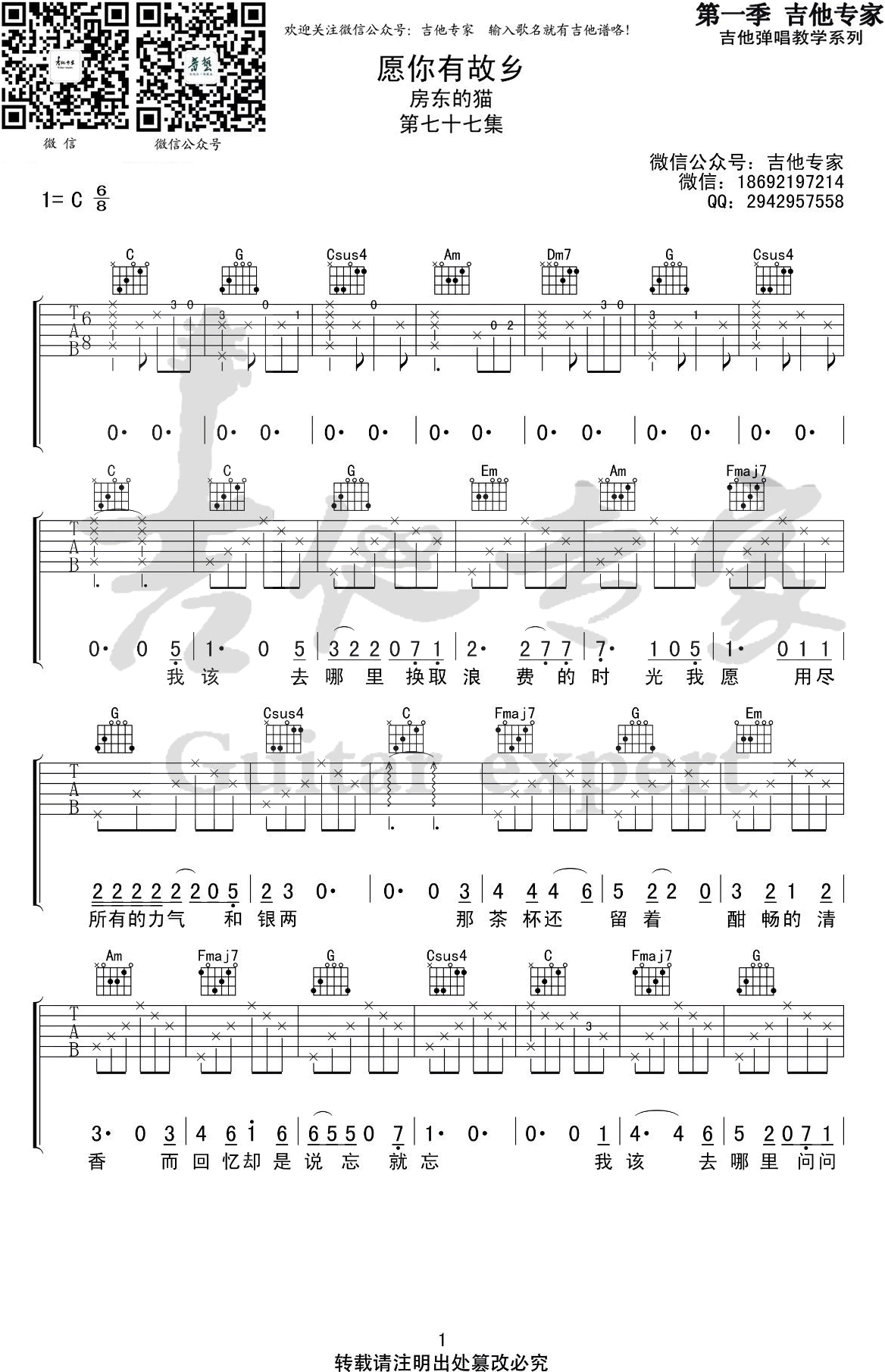 《愿你有故乡》吉他谱,房东的猫演唱的一首新歌,C调弹唱谱,完整版共四张图片谱。愿你有故乡六线谱,感谢吉他专家编配出品...