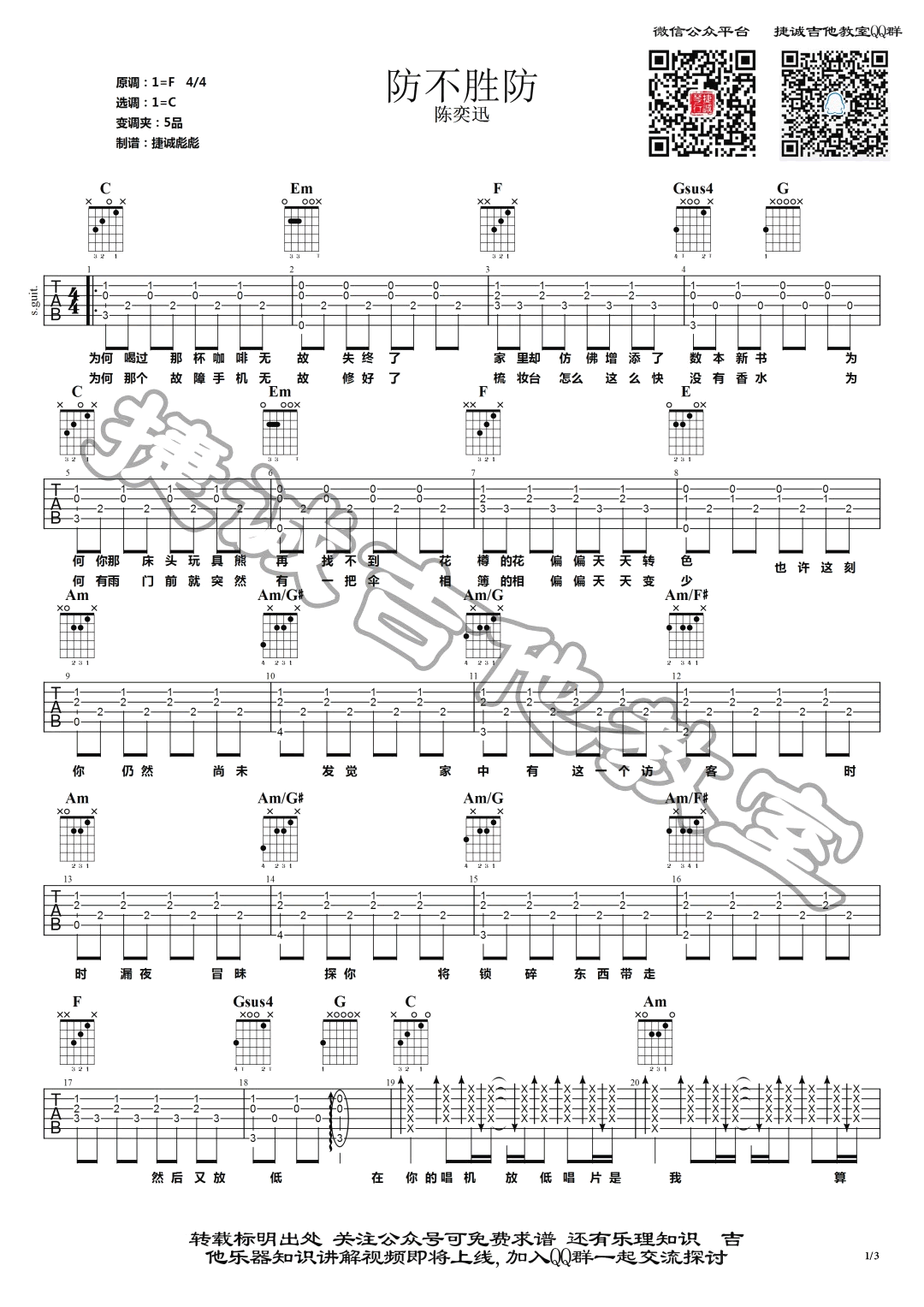 陈奕迅《防不胜防》吉他谱,原调F,选调C,变调夹夹五品。陈奕迅早期一首伤感病态的粤语歌曲,防不胜防六线谱,三张弹唱图片谱,捷诚吉他教室编配...