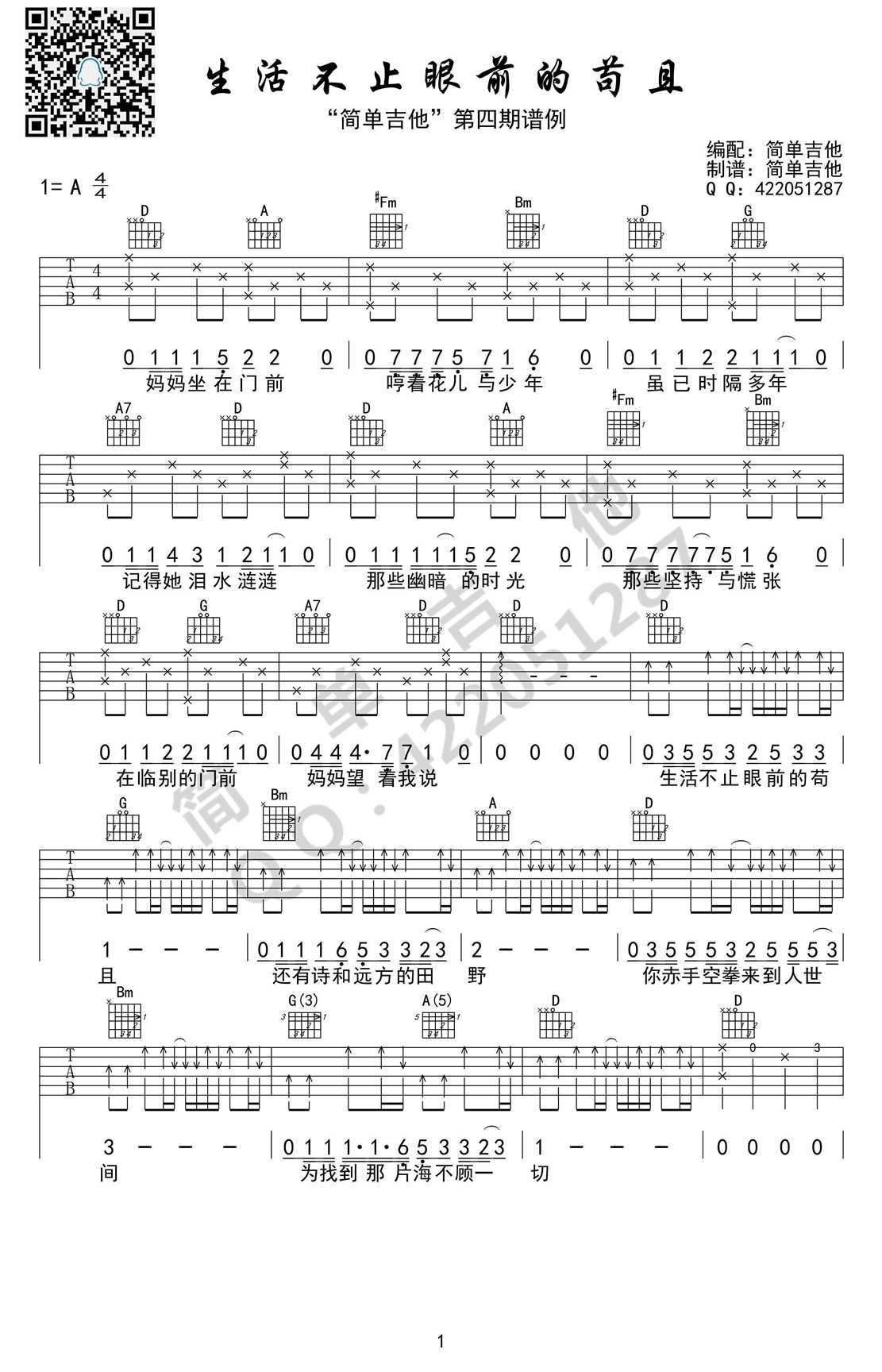 生活不止眼前的苟且吉他谱,A调原版编配,许巍演唱的歌曲,生活不止眼前的苟且吉他六线谱,高晓松词曲《晓松奇谈》片头曲。感谢简单吉他提供高清图片谱分享。...