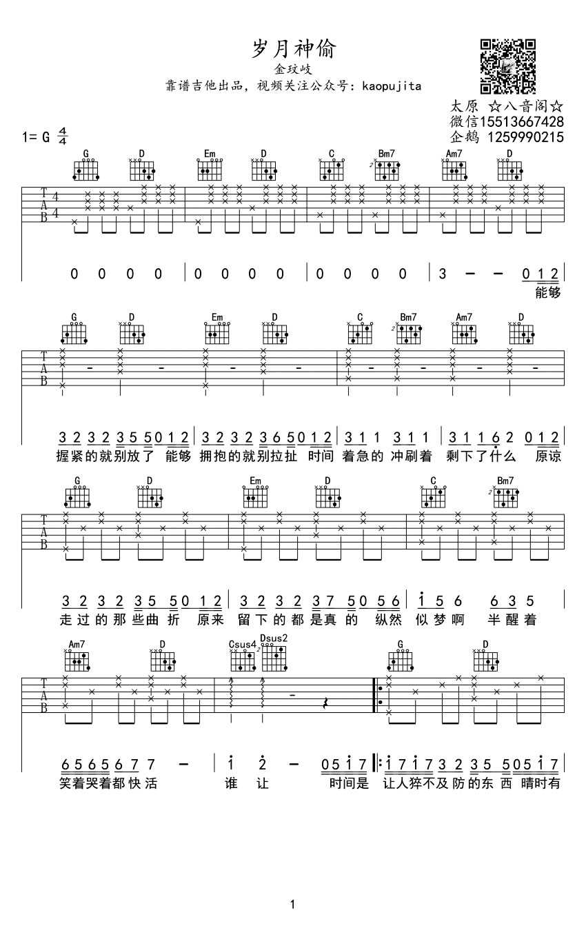 岁月神偷吉他谱,G调六线谱,靠谱吉他出品,音乐才女金玟岐词曲创作演唱,岁月神偷吉他弹唱谱,两张图片谱。...