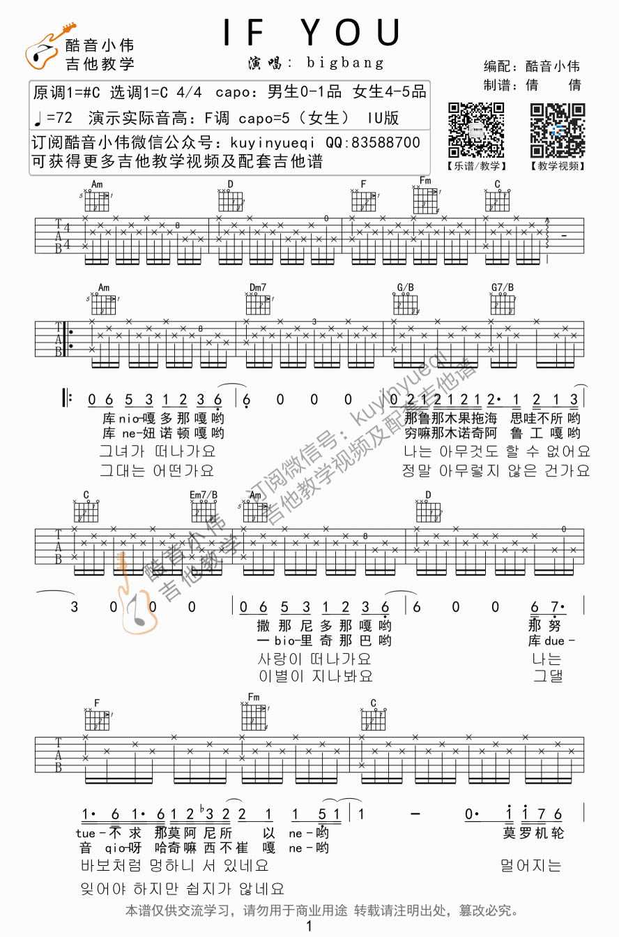 Bigbang演唱的Ifyou吉他谱,C调简单版编配,感谢酷音小伟继i《fyou》吉他谱G调原版的曲谱之后,为方便琴友们弹唱,又特意带来根据IU演唱改编的更适合男女生的通用版本。...