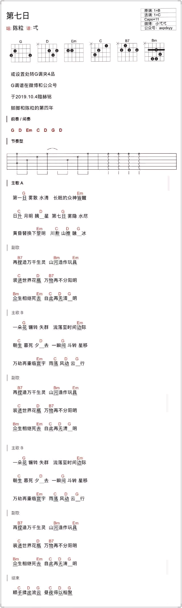 第七日吉他谱,陈粒19年发行的新歌作品,这首歌是对自我的审视,穿越过时间,生命依旧坚定。第七日吉他弹唱谱,原调B,选调C,变调夹夹四品,节奏型参照和弦图片谱标注,感谢爱写谱的小弌弌编配...