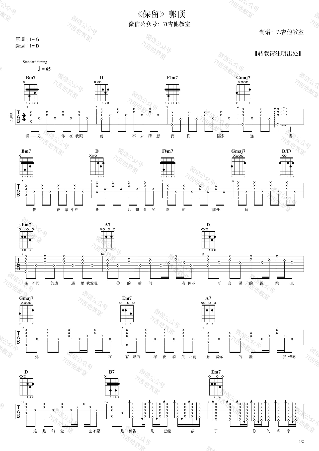 《保留》吉他谱,原调G,选调D,郭顶的一首好听的歌曲,保留六线谱,原调是G大调,用的是D大调的指法来编配,演示视频里是标准音调弦,变调夹第一品,适合音域较低的男生。想唱原调的童鞋夹变调夹第5品就可以了。7t吉他教室编配出品...