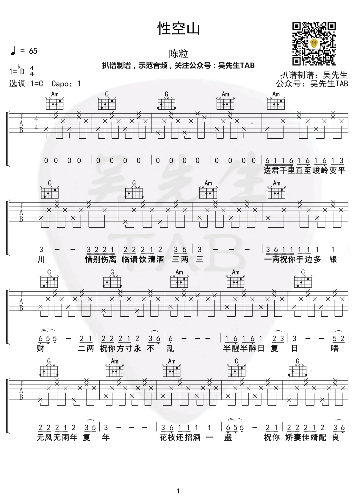 陈粒《性空山》吉他谱,原调bD,选用C调指法,capo夹一品。陈粒一首代表性的民谣歌曲,整首歌都充满着对离别的洒脱和不舍的江湖气息。性空山六线谱,弹唱图片谱,感谢吴先生编配分享...