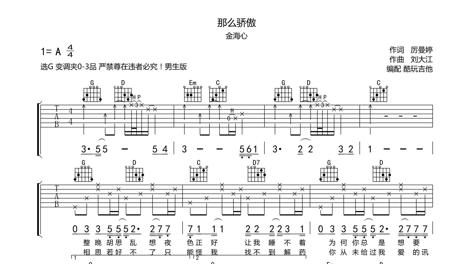 吉他那么骄傲 吉他谱 金海心 G调 男生版